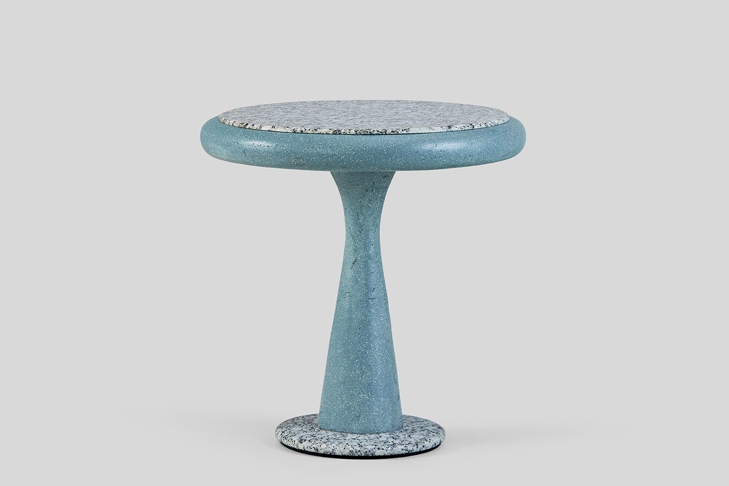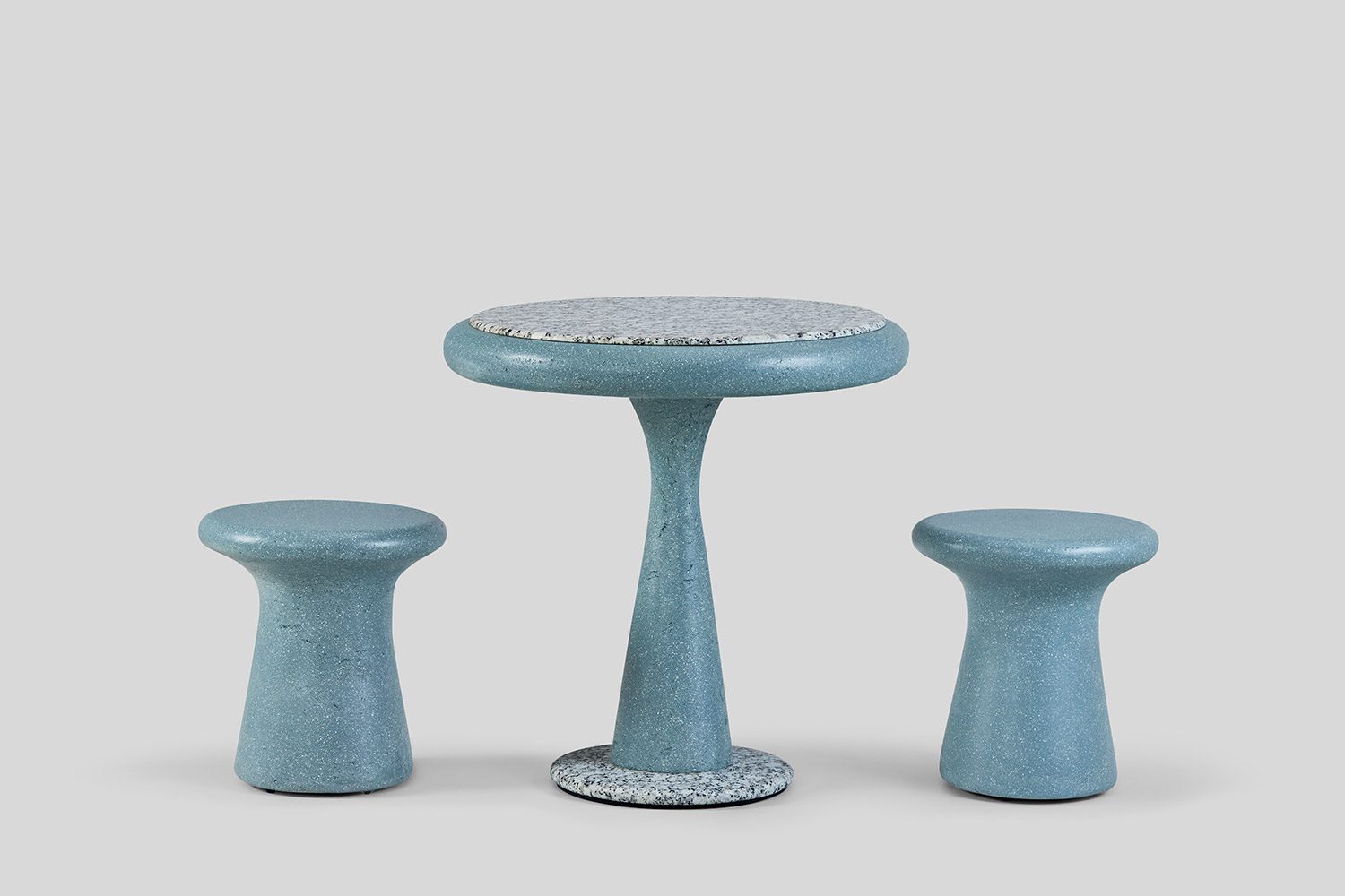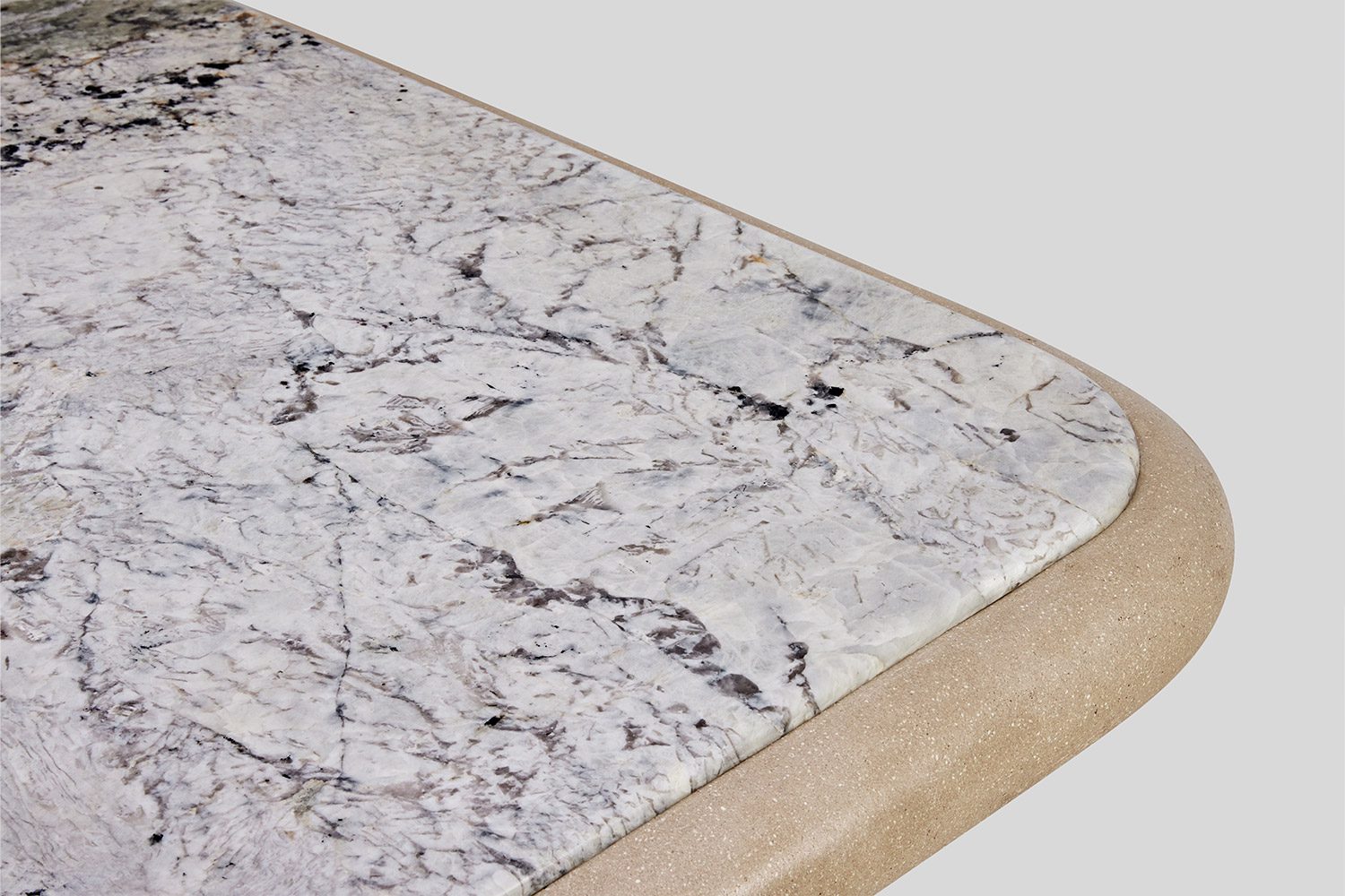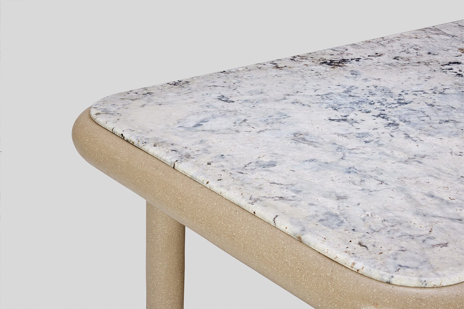 The Sol Dining Table showcases a knockdown design with a natural stone top. Its exterior is coated in weather resistant Gesso Esterno, making it suitable for various climates. Beneath this durable finish lies a lightweight yet robust fiber composite substructure. With its clean, minimal aesthetics, the table seamlessly fits into a wide range of environments.