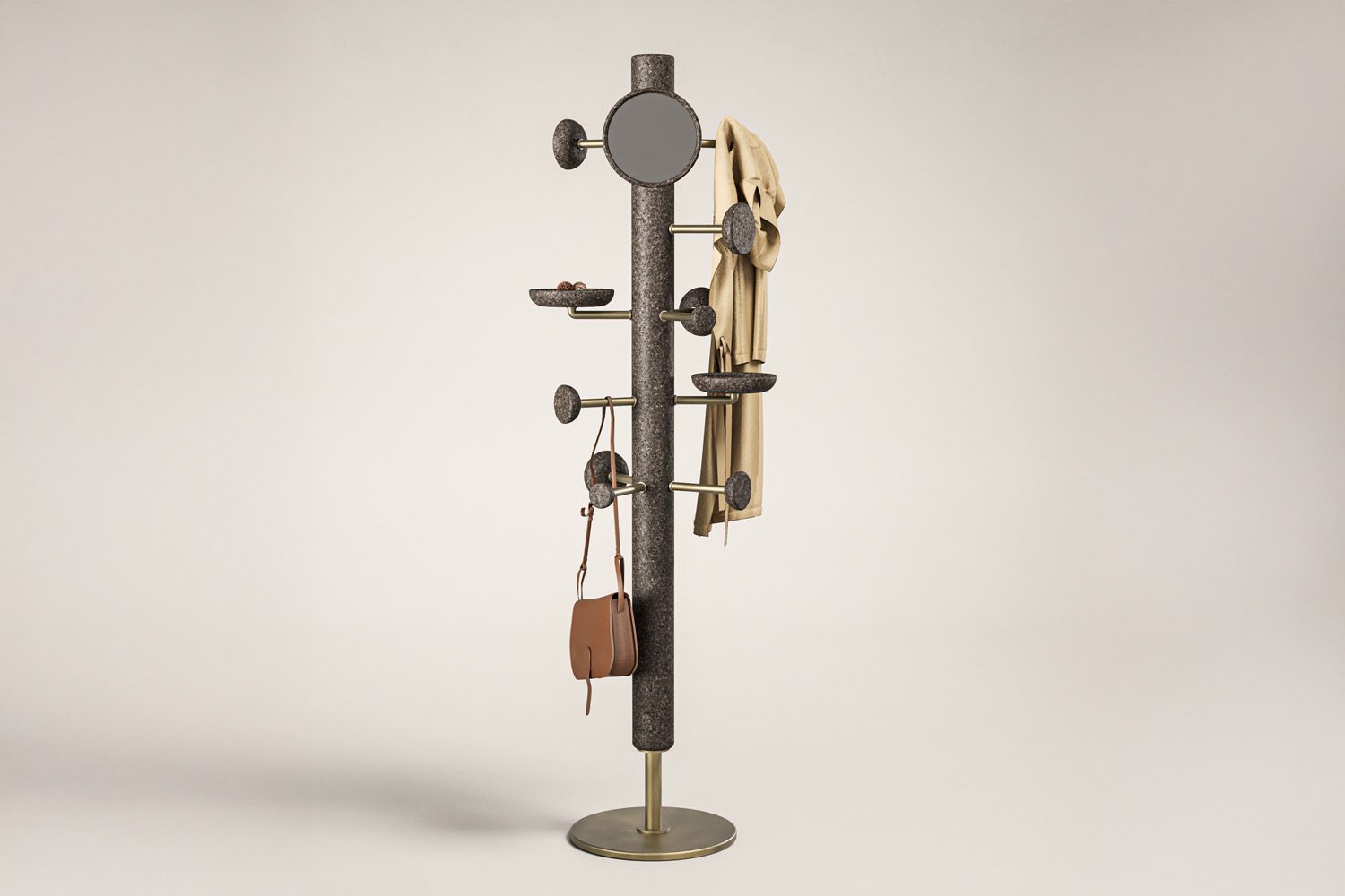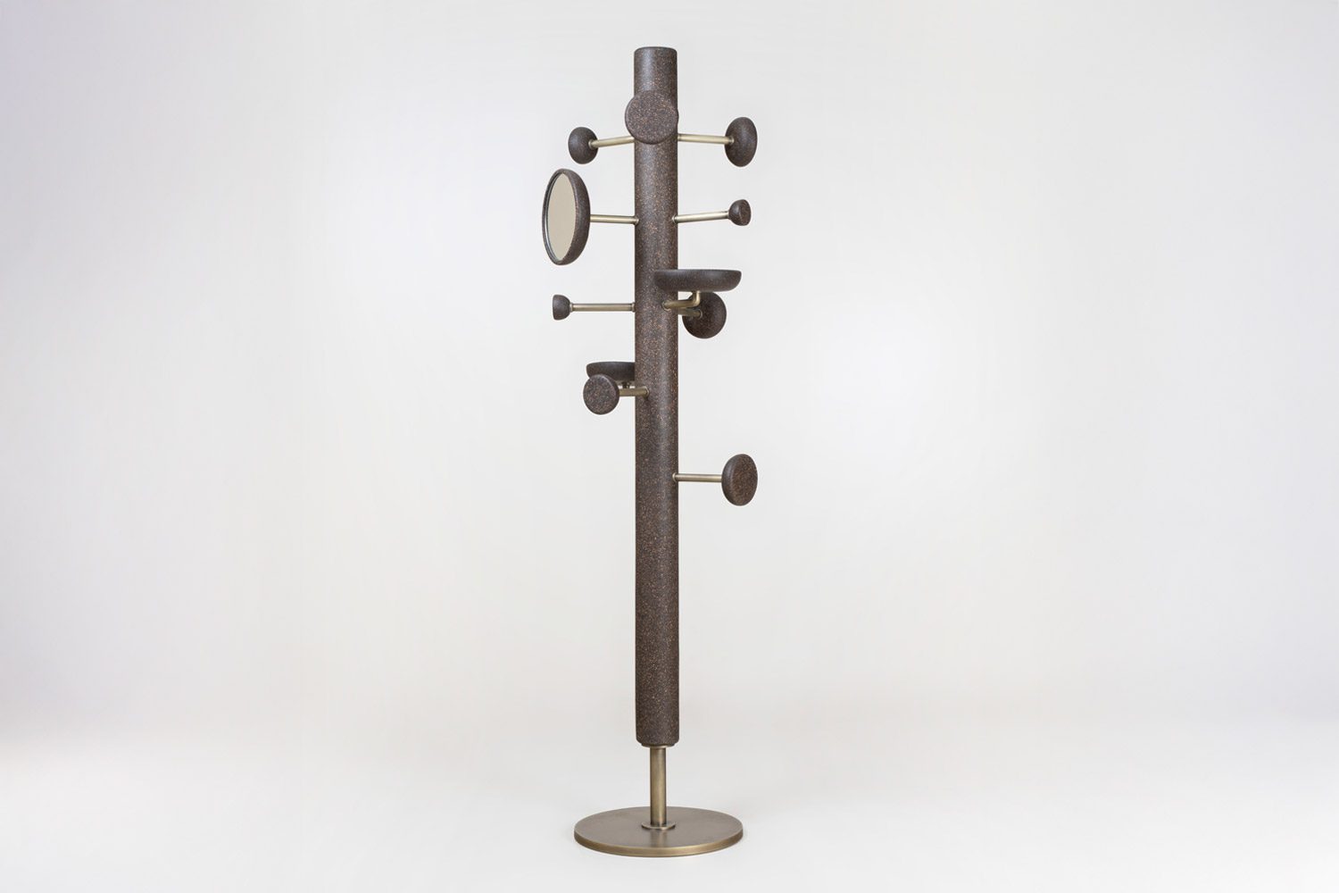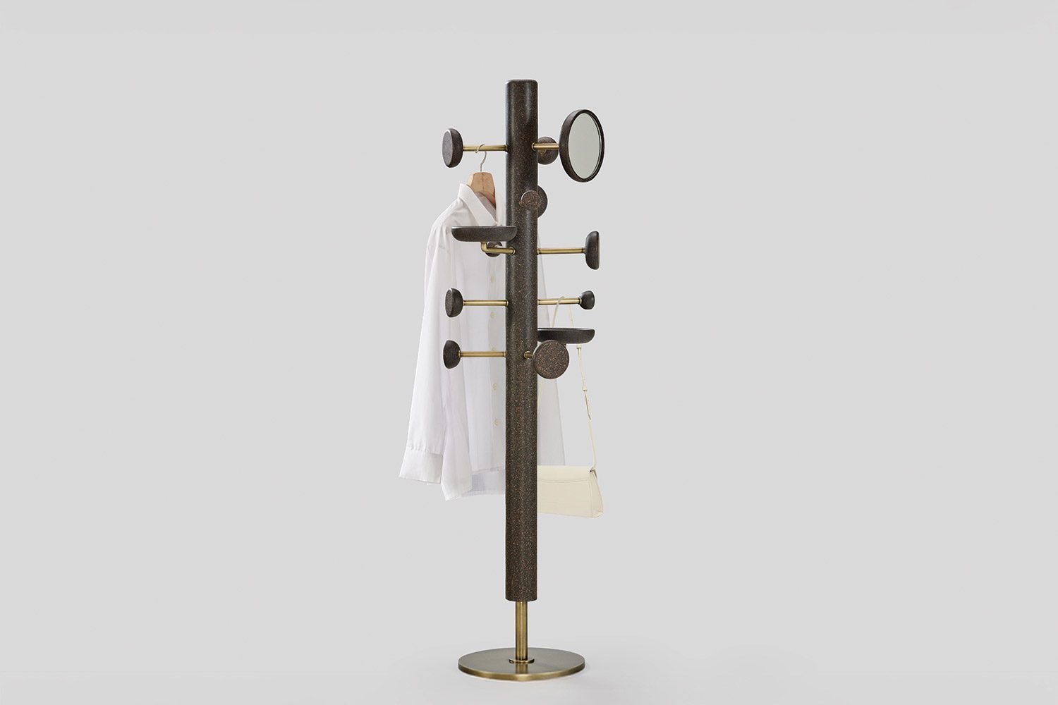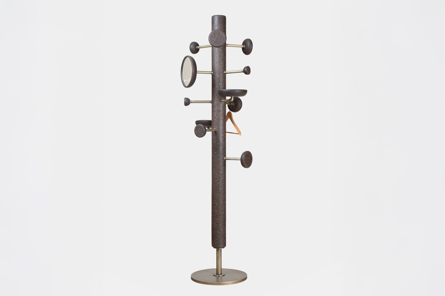The Suro Valet Stand is a utilitarian design that seamlessly combines function with style. Crafted with a focus on practicality, it offers a variety of thoughtfully integrated utilities, including trays, mirrors, hooks, and knobs, designed to hold and organize all your essentials. The stand features cork elements that add a natural, tactile quality, while metal pipe connectors enhance its modern appeal. With a sturdy metal base providing reliable support, the Suro Valet Stand is both durable and visually striking, making it an ideal piece for those who appreciate minimalist design with maximum utility.