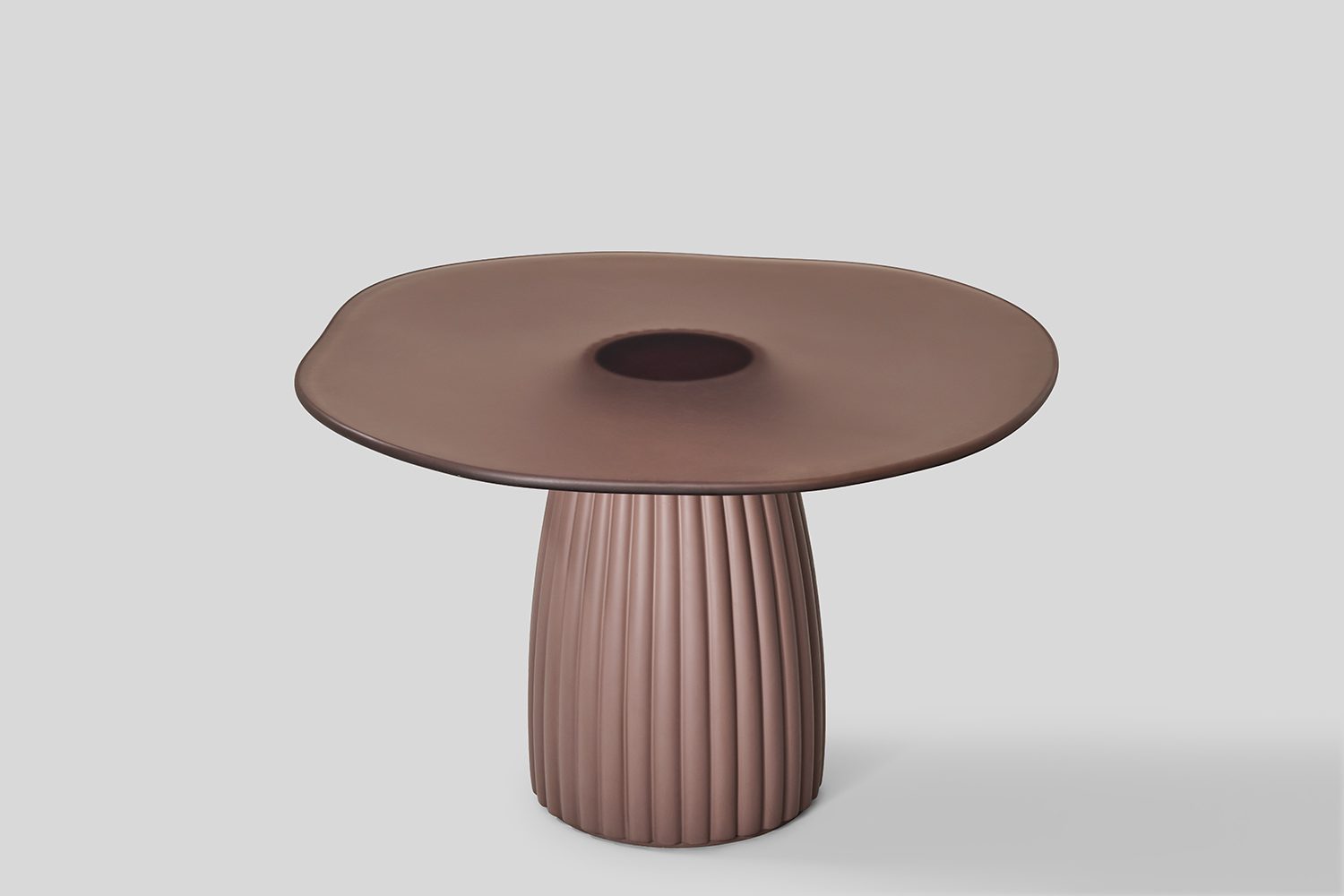 The Sago Tables embodies a synthesis of organic fluidity and structured form, drawing conceptual inspiration from the morphological adaptations of desert cacti. The series translates the visual and functional attributes of these resilient plants into a refined material composition. The table tops, crafted from tinted resin, exhibit a soft translucency that corresponds to the lacquered finish of the vertical structural elements, establishing a cohesive material relationship. The supporting framework, constructed from lacquered wood, features precisely articulated fluting details, evoking the rhythmic, linear growth patterns characteristic of cacti. This interplay between materials and form creates a dialogue between solidity and lightness, structure and fluidity. By abstracting elements from nature, the Sago series transcends conventional tables, positioning itself as both a functional entity and an exploration of biomorphic design principles.