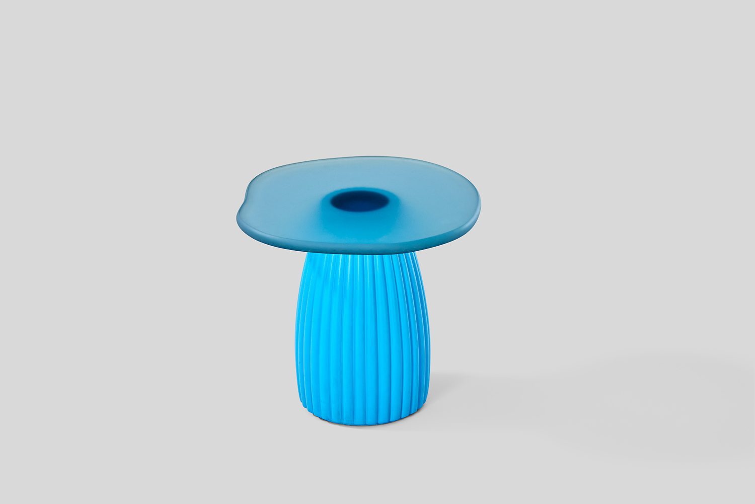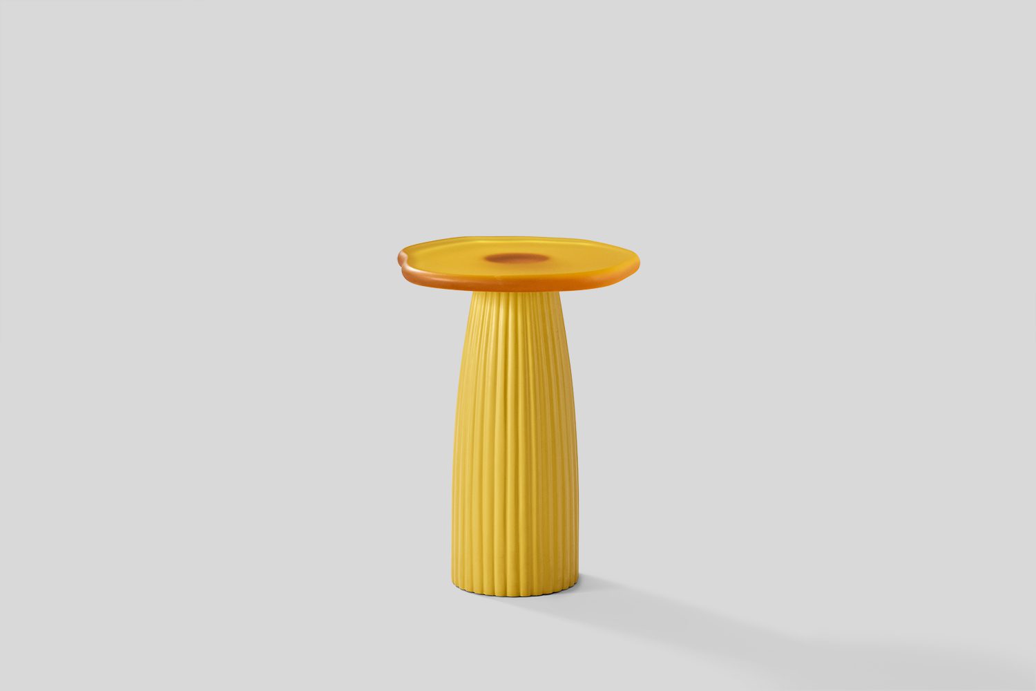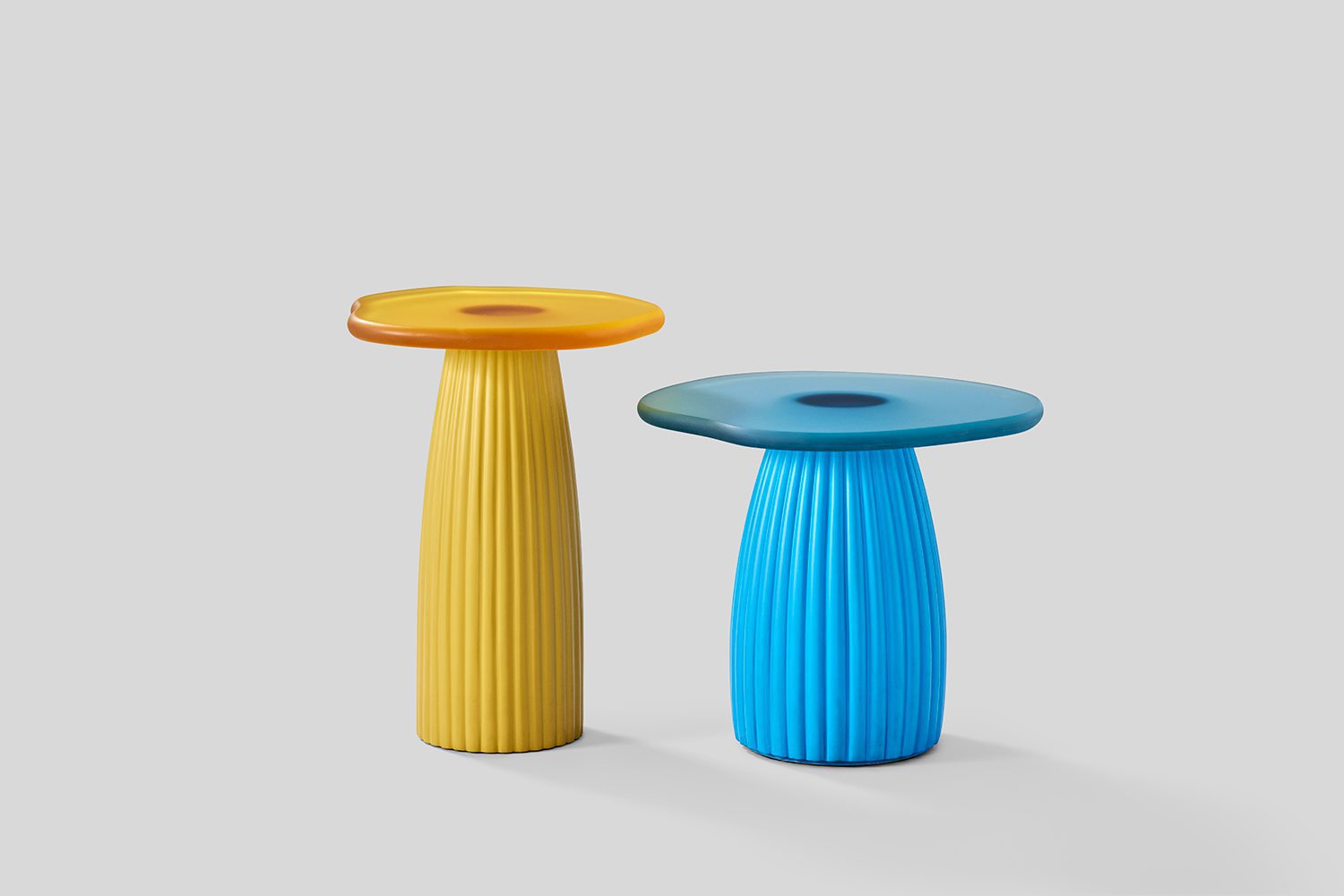 The Sago Tables embodies a synthesis of organic fluidity and structured form, drawing conceptual inspiration from the morphological adaptations of desert cacti. The series translates the visual and functional attributes of these resilient plants into a refined material composition. The table tops, crafted from tinted resin, exhibit a soft translucency that corresponds to the lacquered finish of the vertical structural elements, establishing a cohesive material relationship. The supporting framework, constructed from lacquered wood, features precisely articulated fluting details, evoking the rhythmic, linear growth patterns characteristic of cacti. This interplay between materials and form creates a dialogue between solidity and lightness, structure and fluidity. By abstracting elements from nature, the Sago series transcends conventional tables, positioning itself as both a functional entity and an exploration of biomorphic design principles.
