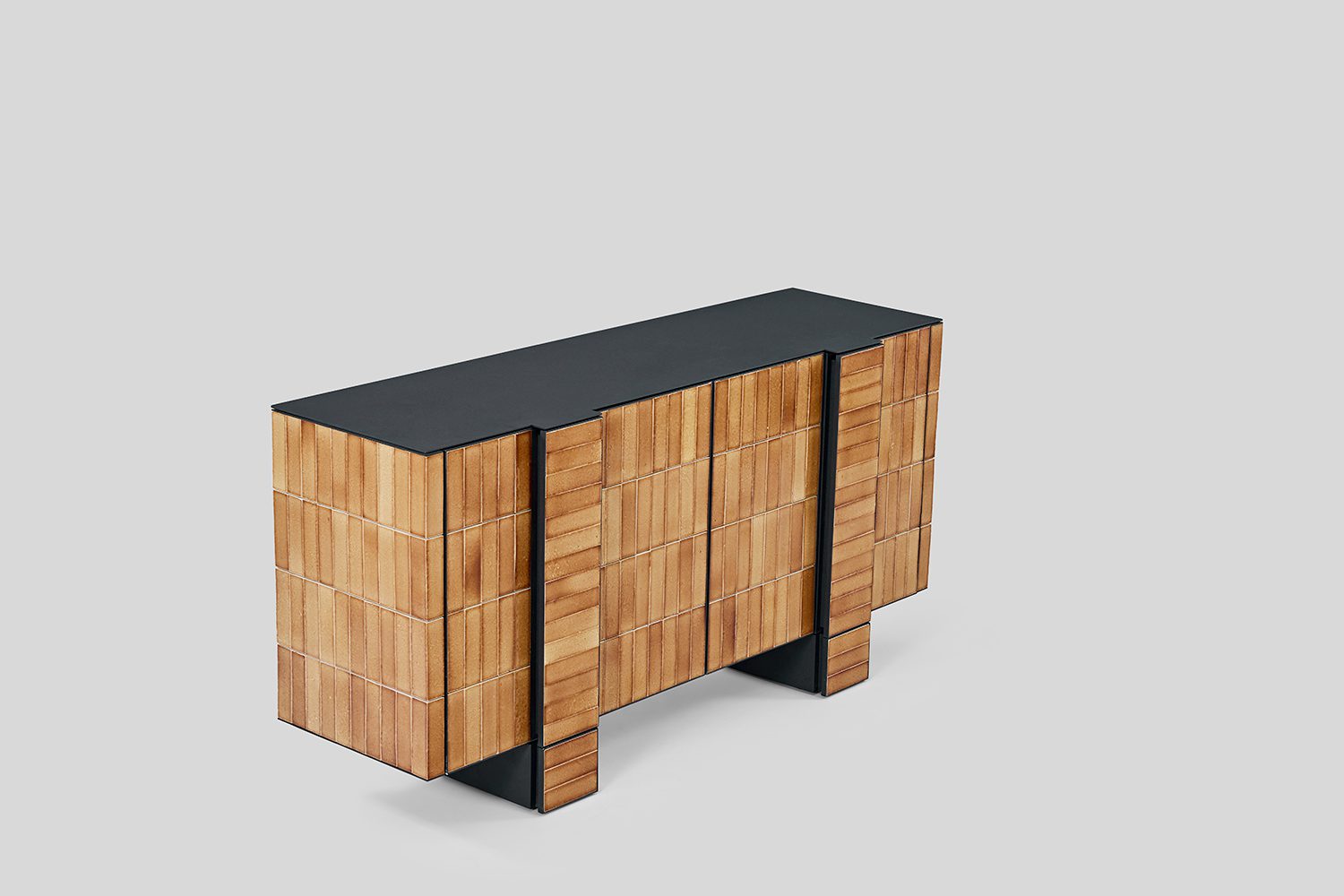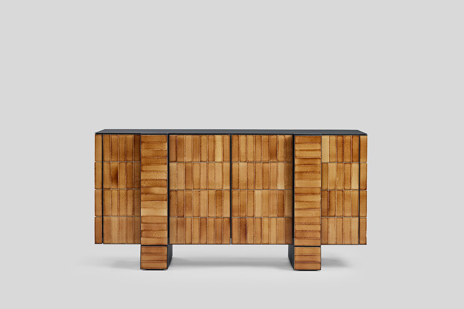 The Bento Sideboard is a celebration of contrasts, where the beauty of imperfection meets the precision of geometry. Crafted with a combination of handmade tiles and sheet metal, each tile tells its own story—embracing subtle imperfections that add character and warmth. The geometric shape and careful laying pattern of the tiles create a visual contrast, highlighting the harmony between organic nature of materials and modern design. The Bento Sideboard invites you to appreciate the charm in every imperfect detail, making it not just a functional piece, but an artistic statement.