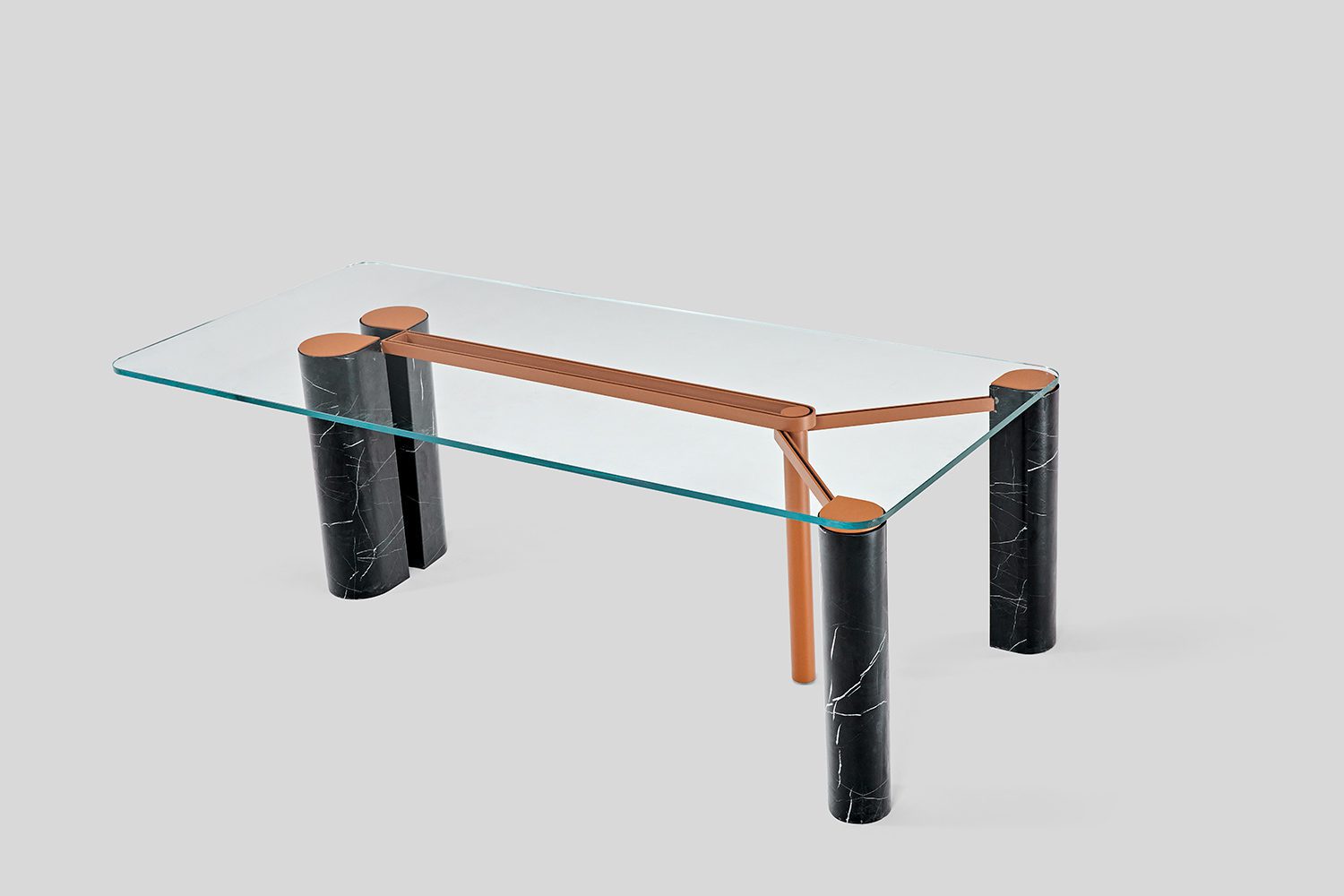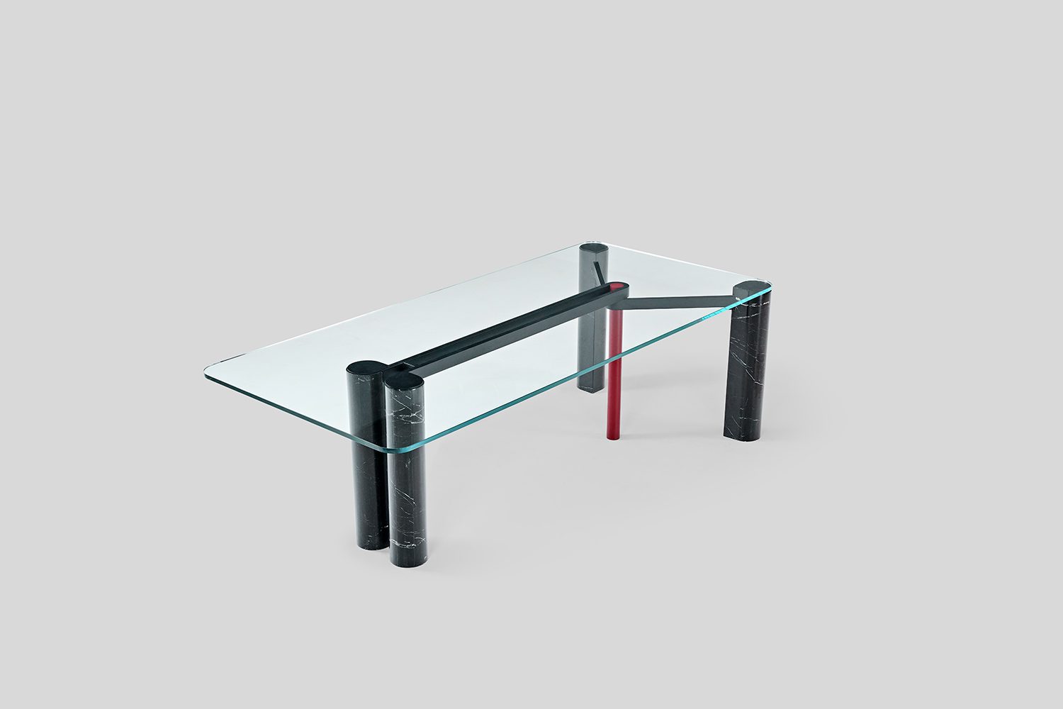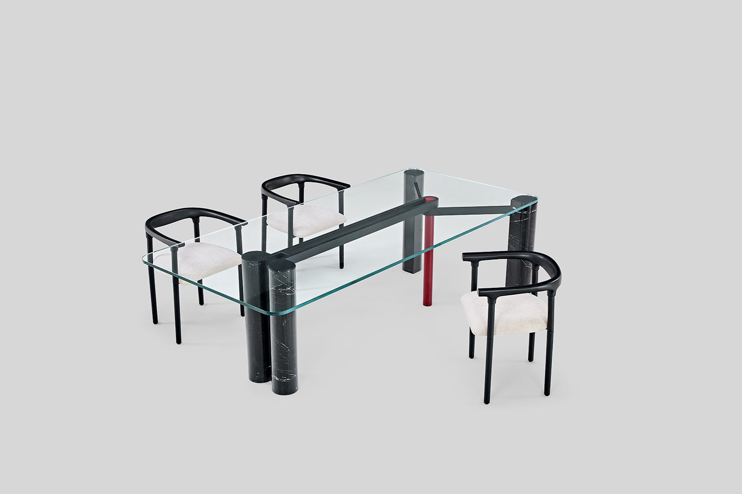 The Link Dining Table is a bold reimagination of a dining table design, offering an interesting blend of materials and unconventional leg placements. Its clear glass top provides unobstructed visibility, allowing the dynamic positioning of the legs to take center stage. Unlike traditional dining tables with four corner legs or a central pedestal, the Link features multiple staggered legs in a mix of lacquer and veneer, with this metal strips connecting them. This unique leg configuration creates a sense of movement and balance, transforming the table from a functional piece into a visual piece.