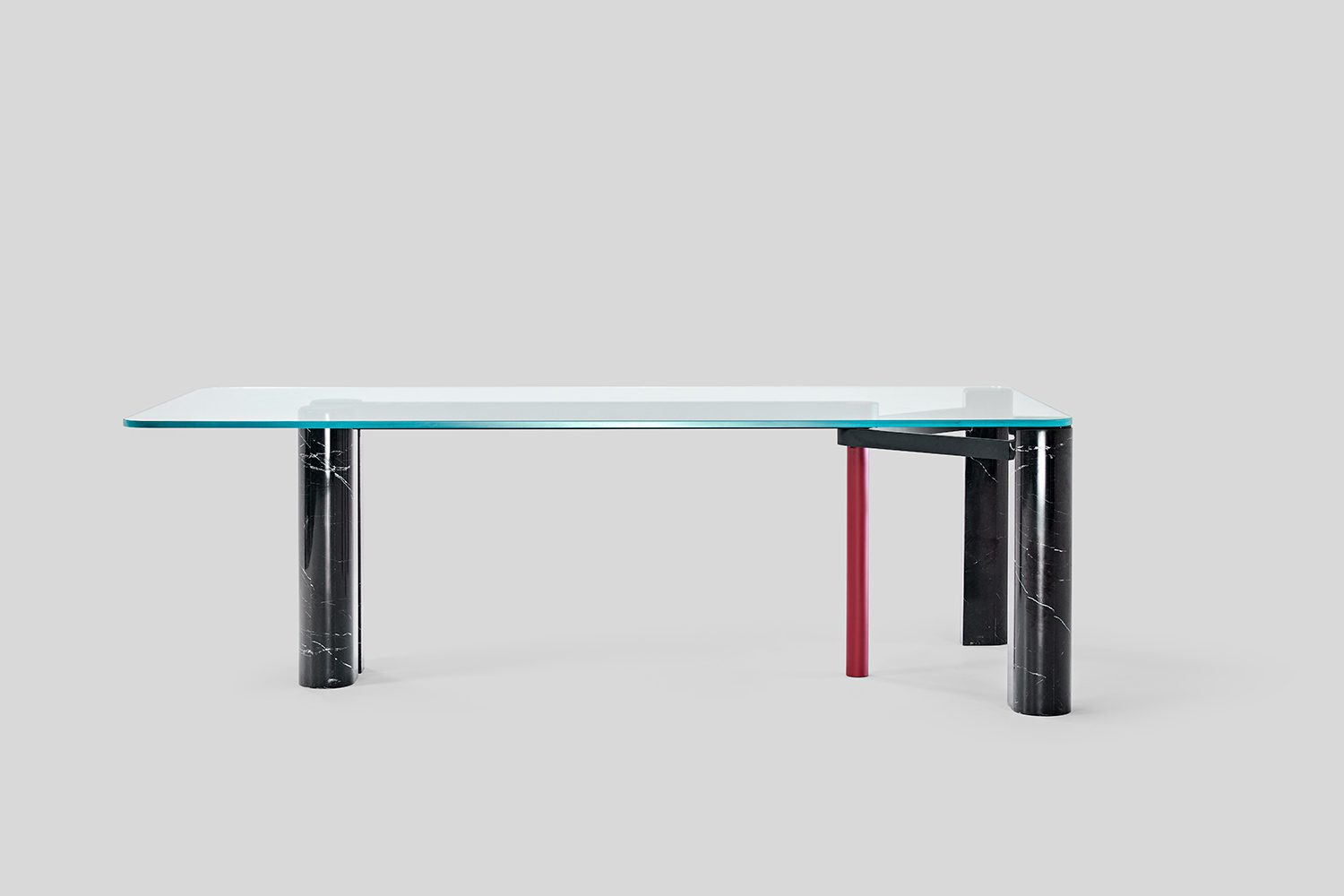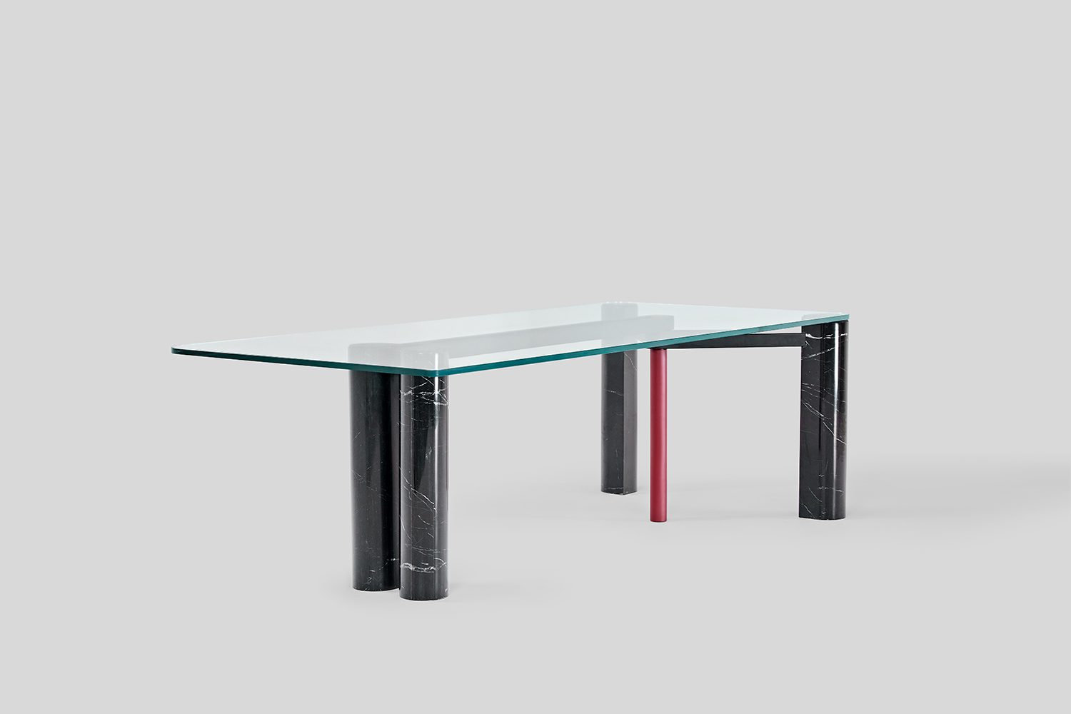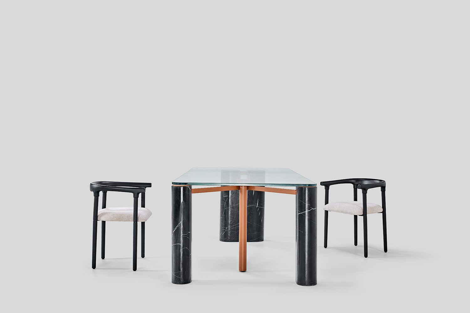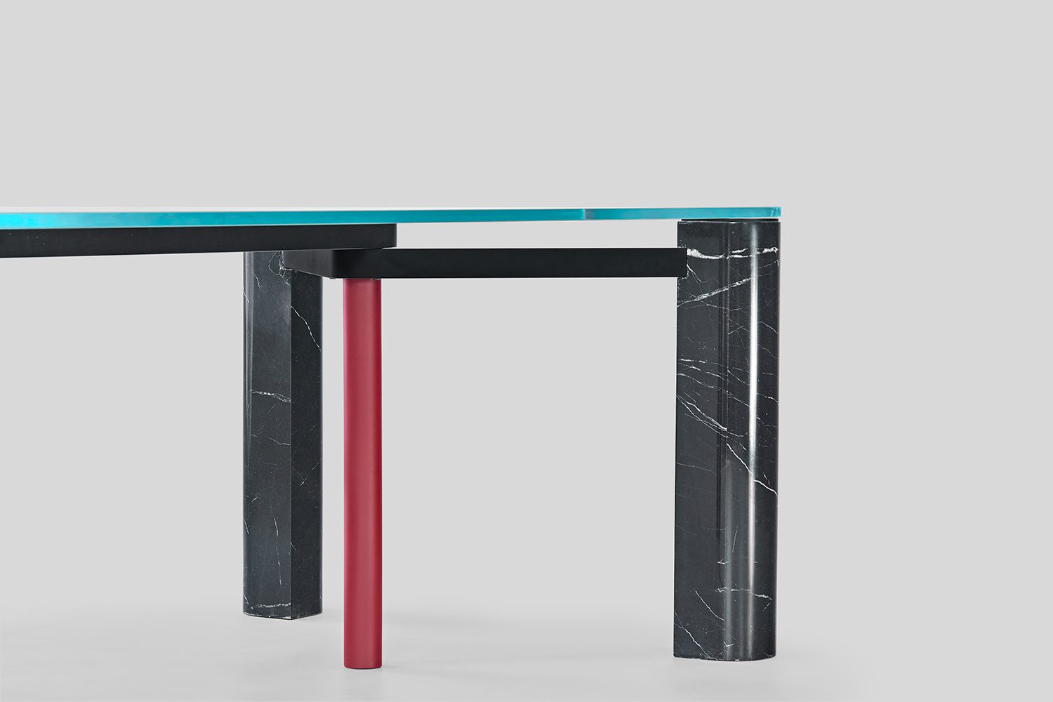 The Link Dining Table is a bold reimagination of a dining table design, offering an interesting blend of materials and unconventional leg placements. Its clear glass top provides unobstructed visibility, allowing the dynamic positioning of the legs to take center stage. Unlike traditional dining tables with four corner legs or a central pedestal, the Link features multiple staggered legs in a mix of lacquer and veneer, with this metal strips connecting them. This unique leg configuration creates a sense of movement and balance, transforming the table from a functional piece into a visual piece.