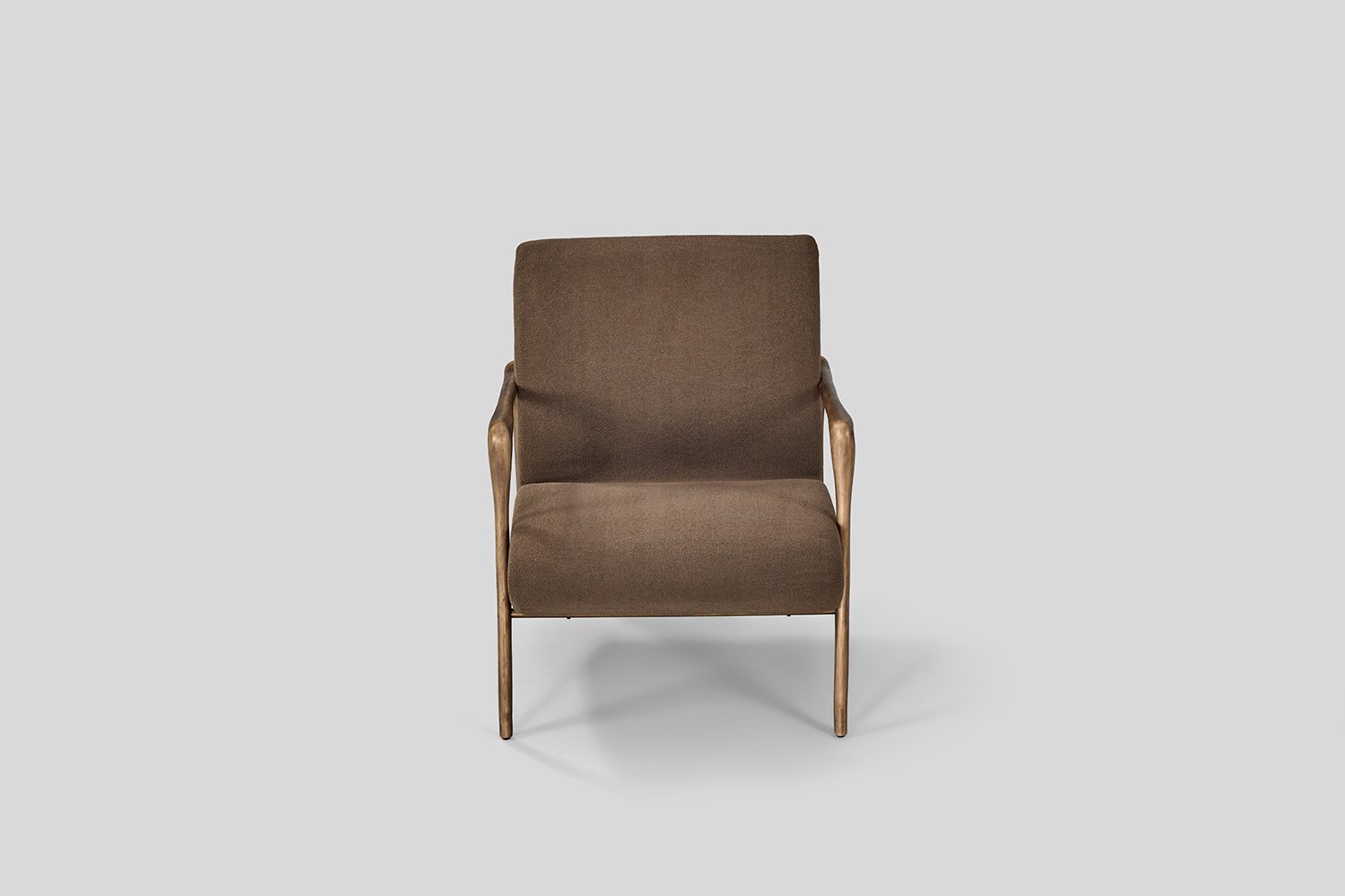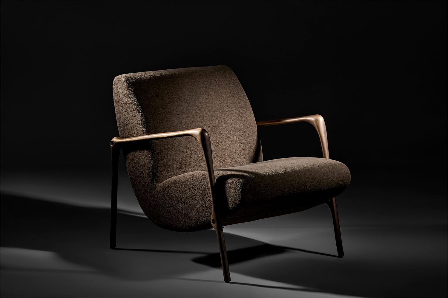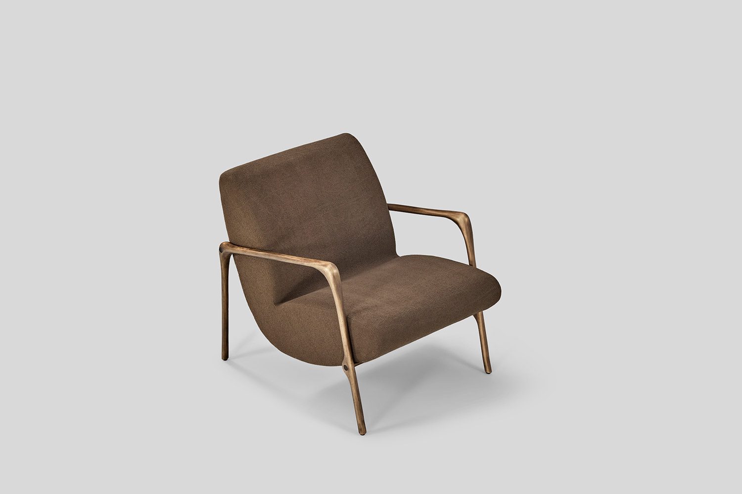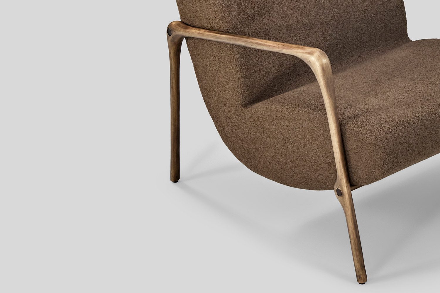 Molly is a single homogeneous upholstered form, conceiving the seat and backrest as a homogeneous form – fluid and continuous. Unified upholstery wraps around the back and the seat – encasing this upholstered form is a sculptural frame in cast brass with a bronze finish. The metal structure outlines and supports the wide seat & back, creating the impression that the cushioned body is suspended within it. The smaller iteration is offered as Molly Lounge Chair, while the extended version becomes the Molly Sofa – retaining the same suspended character and material dialogue at a broader scale.