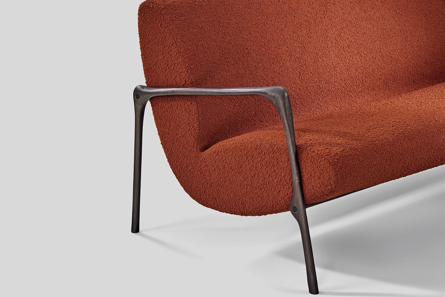 Molly is a single homogeneous upholstered form, conceiving the seat and backrest as a homogeneous form – fluid and continuous. Unified upholstery wraps around the back and the seat – encasing this upholstered form is a sculptural frame in cast brass with a bronze finish. The metal structure outlines and supports the wide seat & back, creating the impression that the cushioned body is suspended within it. The smaller iteration is offered as Molly Lounge Chair, while the extended version becomes the Molly Sofa – retaining the same suspended character and material dialogue at a broader scale.