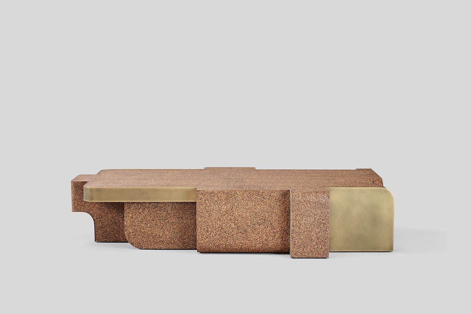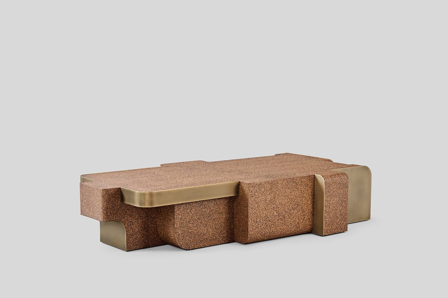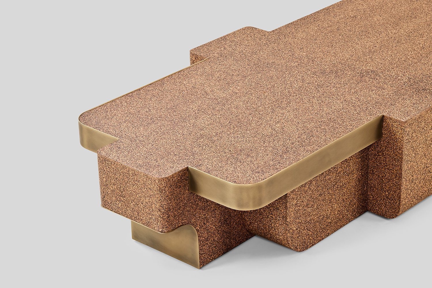The Blocco Tables are a bold exploration of the architectural building construction process, crafted primarily from natural cork to emphasize sustainability and organic form. Inspired by zoning, cutting, and extruding, the design features clean, geometric lines and elevated surfaces that represent the dynamic layering of architecture. Subtle cuts and divisions highlight the zoning aspect, while select metal sheet highlights on some surfaces add a sophisticated contrast, symbolizing the precision and strength of structural elements. The combination of cork’s warmth and the metal’s sleek finish creates a striking balance of organic and industrial, making the Blocco Tables both an artistic statement and a functional addition to any space.