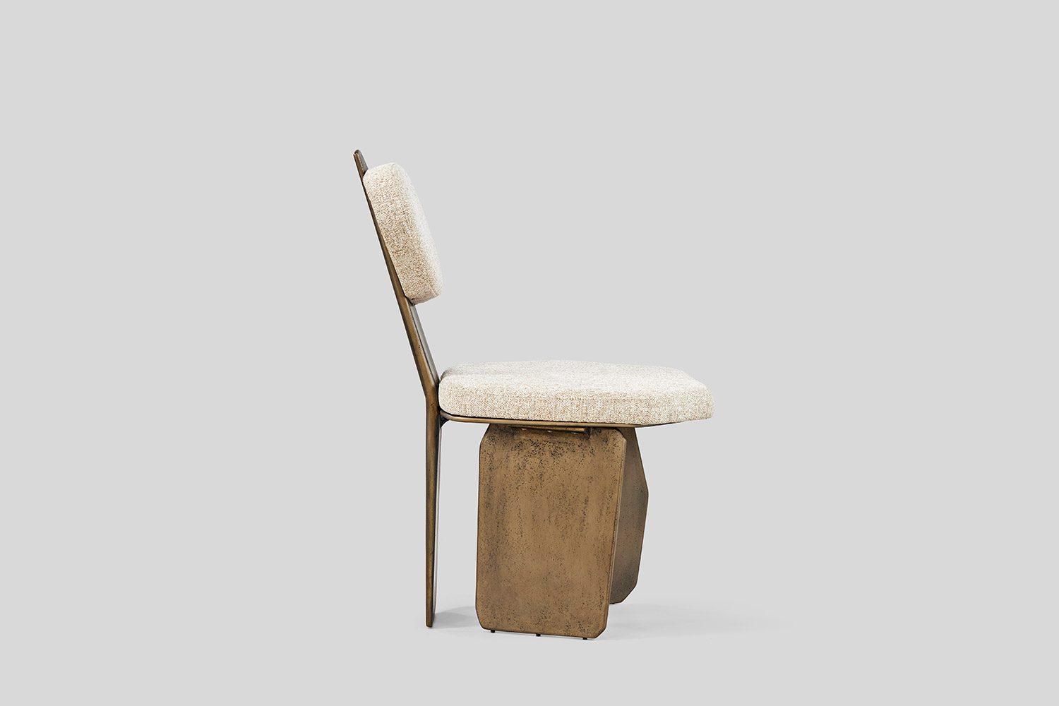 The chairs seamlessly complement the collection with their sculptural forms and inviting comfort. The bold, geometric leg designs—angled with precision—lend a dynamic stability to the pieces, grounding them while evoking a sense of motion.