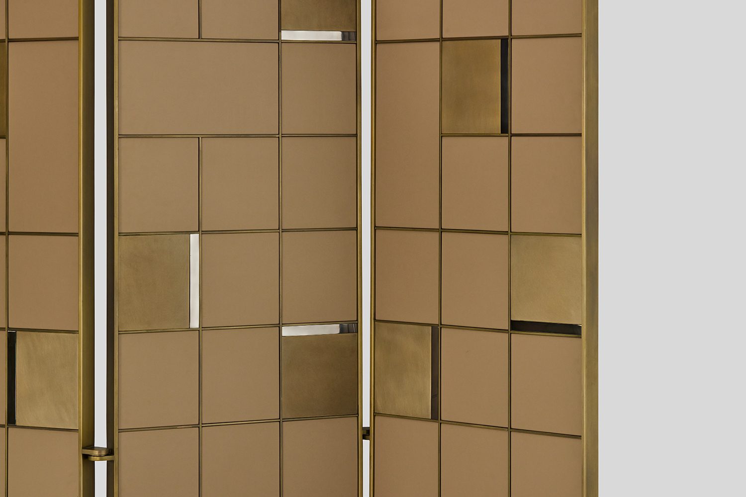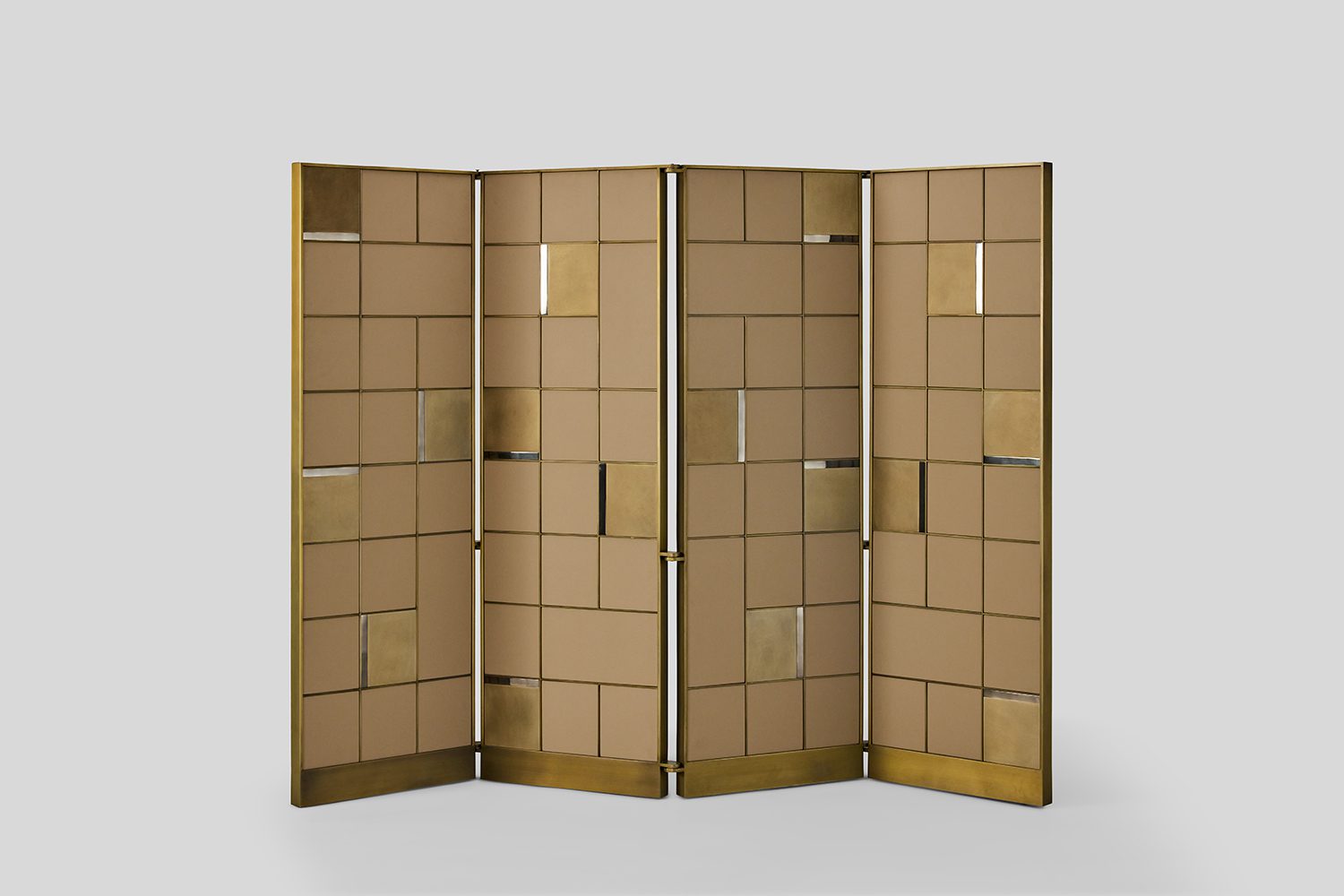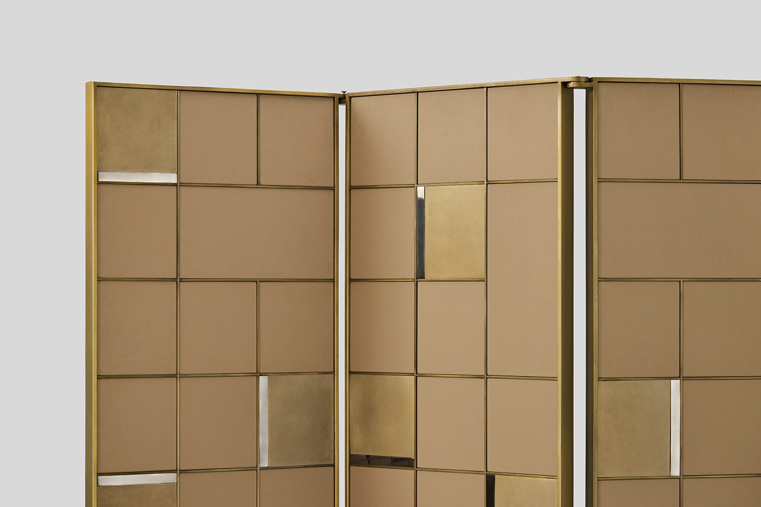 The Endur D Partition Screen is a room divider with adjustable panels that enhances your living and dining spaces in an elegant, sophisticated and subtle way. The play of geometric shapes and linear patterns with the contrasting combination of materials make them unique and interesting. Each panel in the screen is enriched with the juxtaposition of flat, rectangular elements in eco leather and metal, highlighted with metal trims.