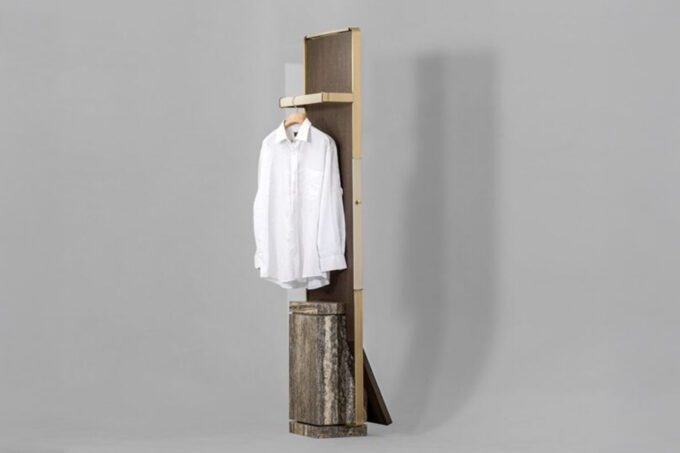Stiva is a multipurpose free standing valet stand, well suited for domestic and office environments. It consists of a hanger rail on the top for coats and garments, a hanger rail in the middle for accessories, and a tray at the bottom for shoes. The vertical posts cladded in eco leather hold the top and bottom shelves coated in metallic colour. The simple contemporary design wins attention for the subtle highlights and details in metal.