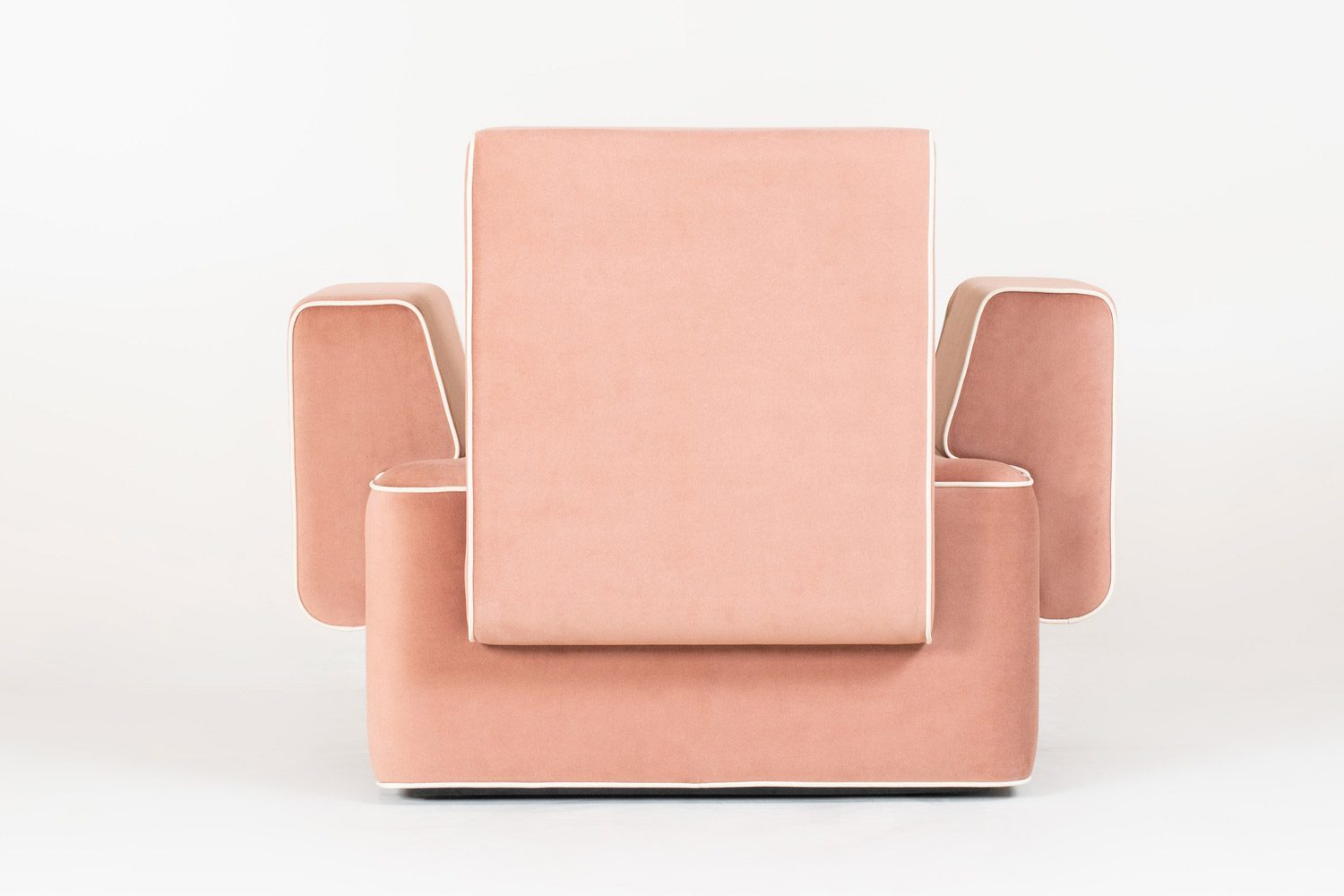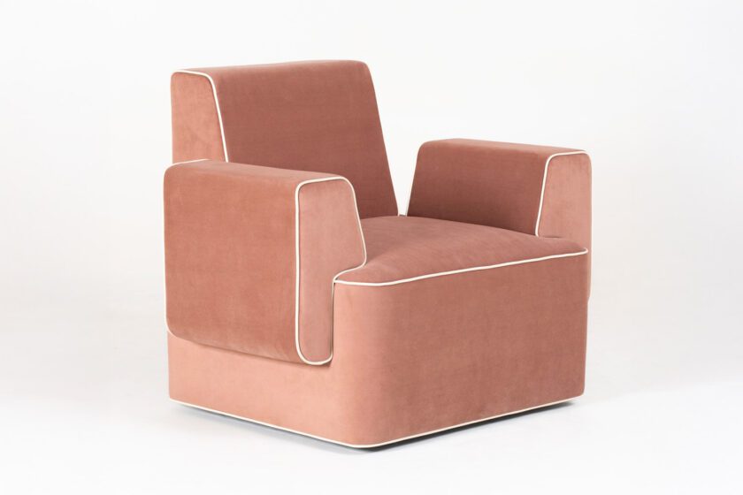 A key design feature is the piping framework, which enhances the visual definition of the piece, while the cavity between the armrest and backrest introduces depth and contrast, breaking the monotony of solid forms and adding a sense of lightness to the overall structure.
