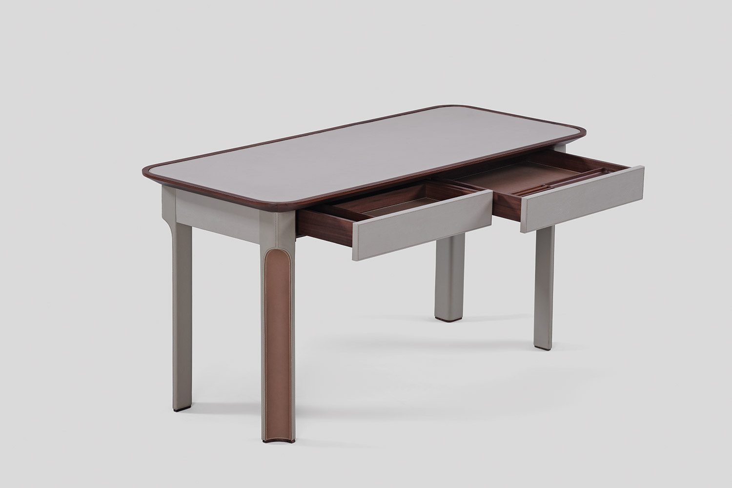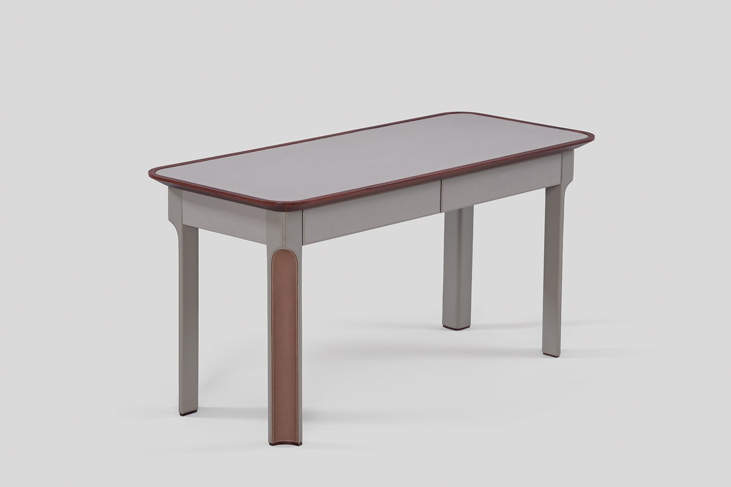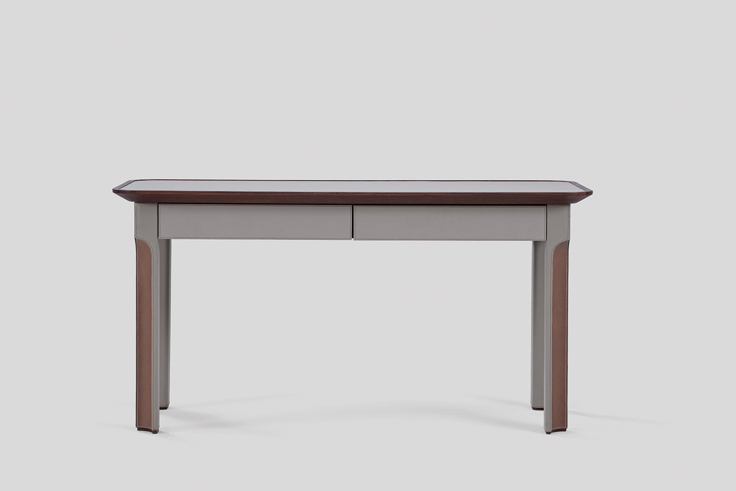 A solid wood border frames the tabletop, adding warmth to the composition, while integrated drawers are seamlessly incorporated for functional storage. Crafted in wood and eco leather, the Arque Study Desk offers a balanced combination of material richness and everyday usability.