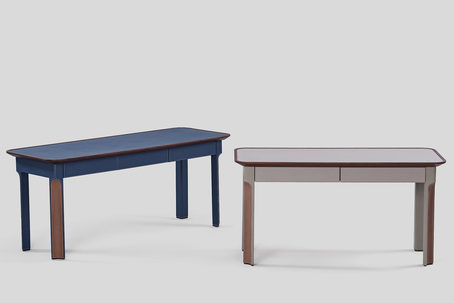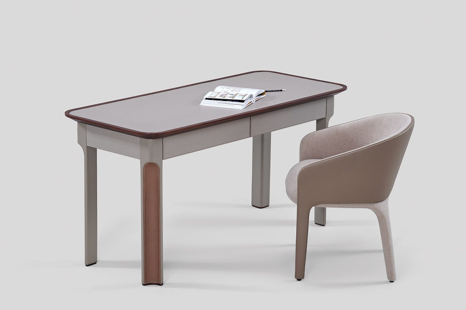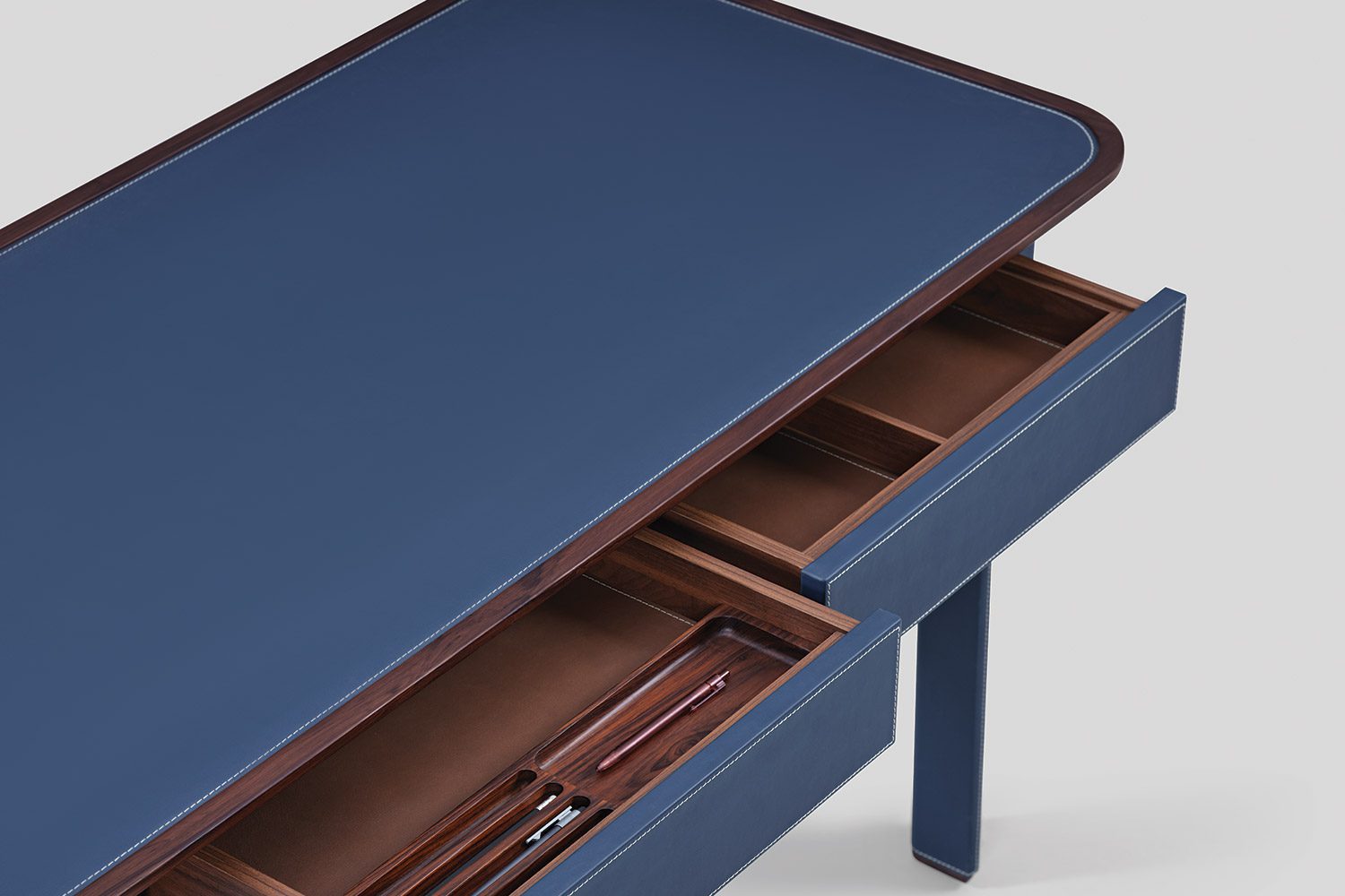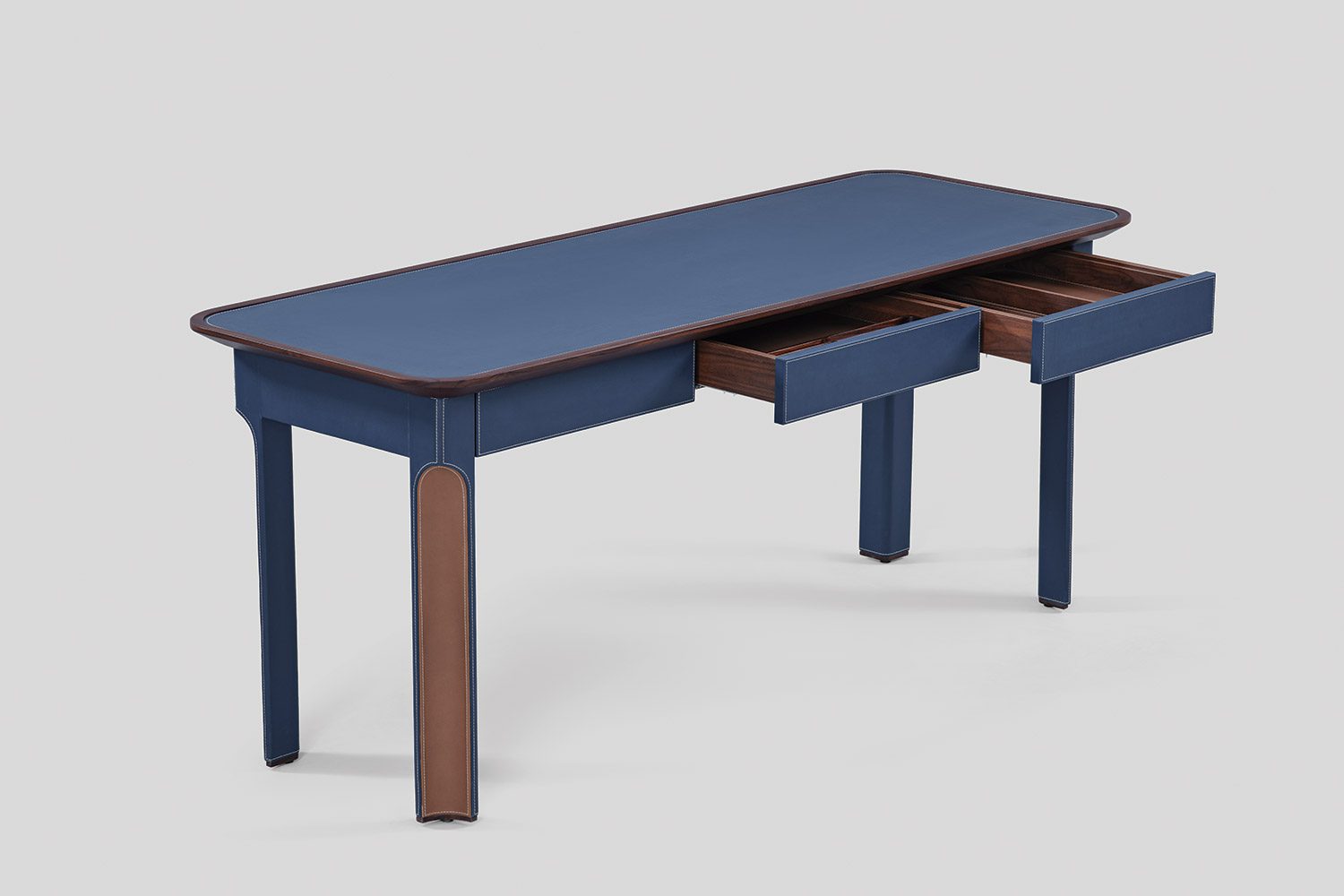A solid wood border frames the tabletop, adding warmth to the composition, while integrated drawers are seamlessly incorporated for functional storage. Crafted in wood and eco leather, the Arque Study Desk offers a balanced combination of material richness and everyday usability.