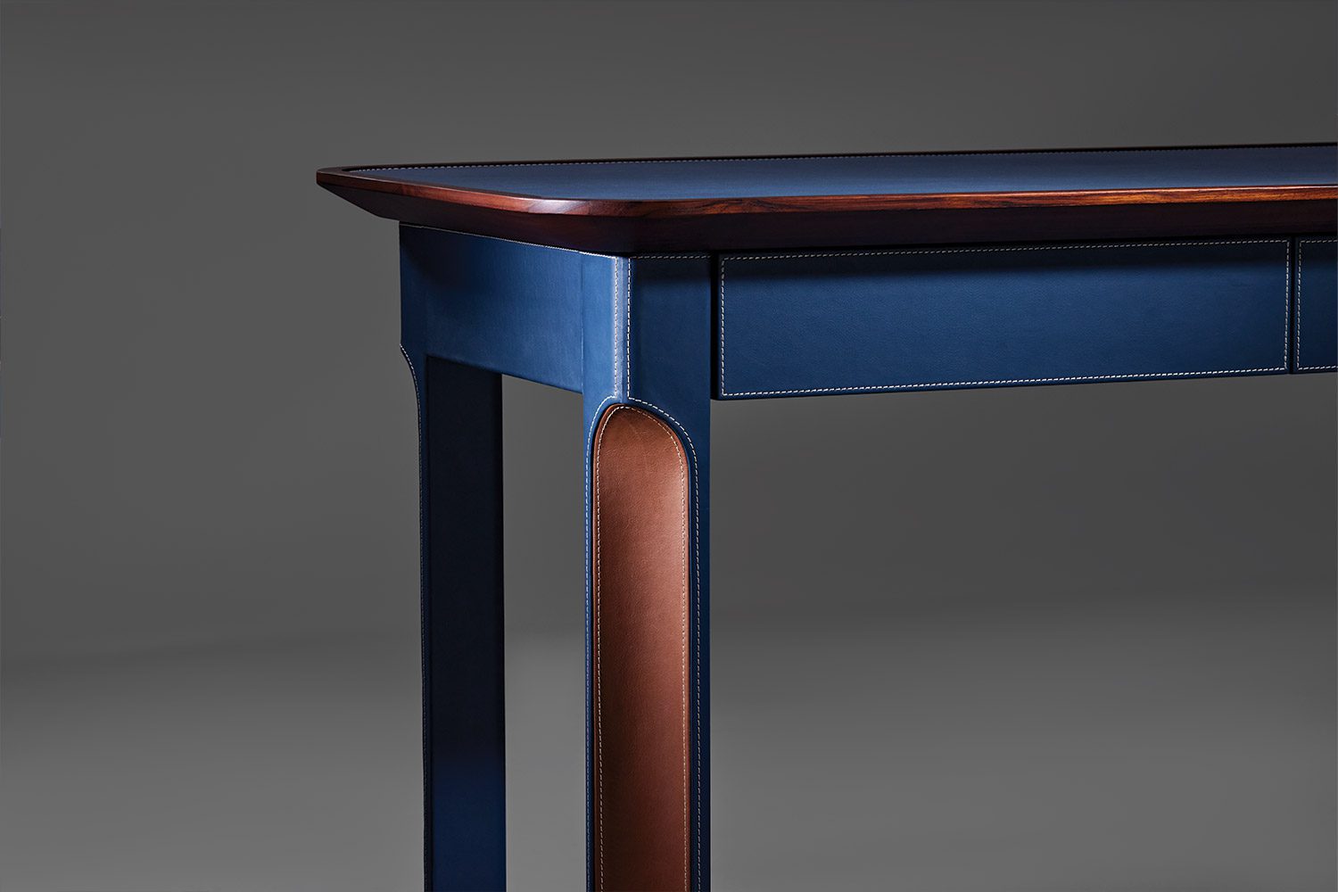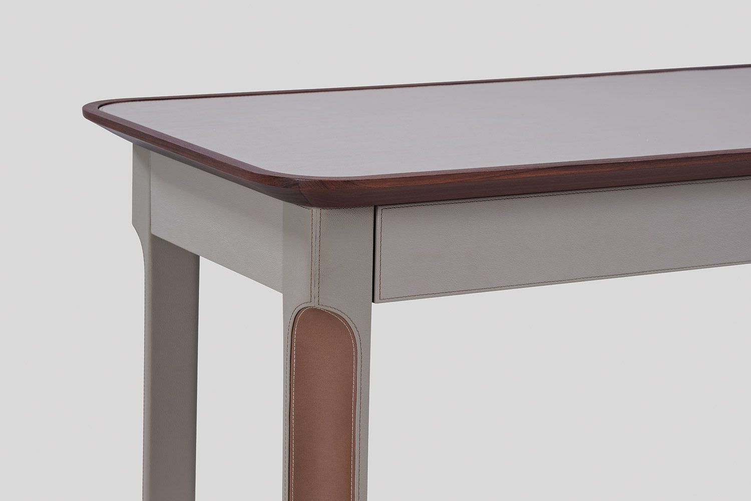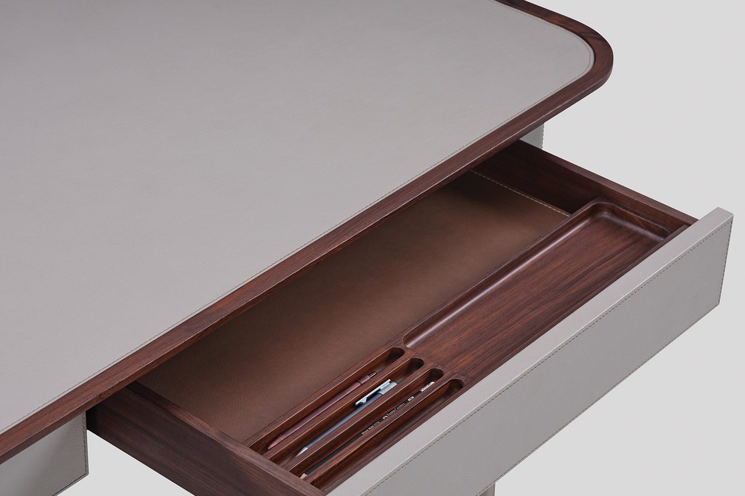 The Arque Study Desk is a contemporary workspace defined by its soft geometry and elegant form with thoughtful detailing. Defined by its soft edges and sculpted proportions, the desk introduces a sense of lightness while maintaining a strong architectural presence. The eco leather-clad structure, detailed with precise stitching and contrast inlay, creates a refined and tailored appearance.