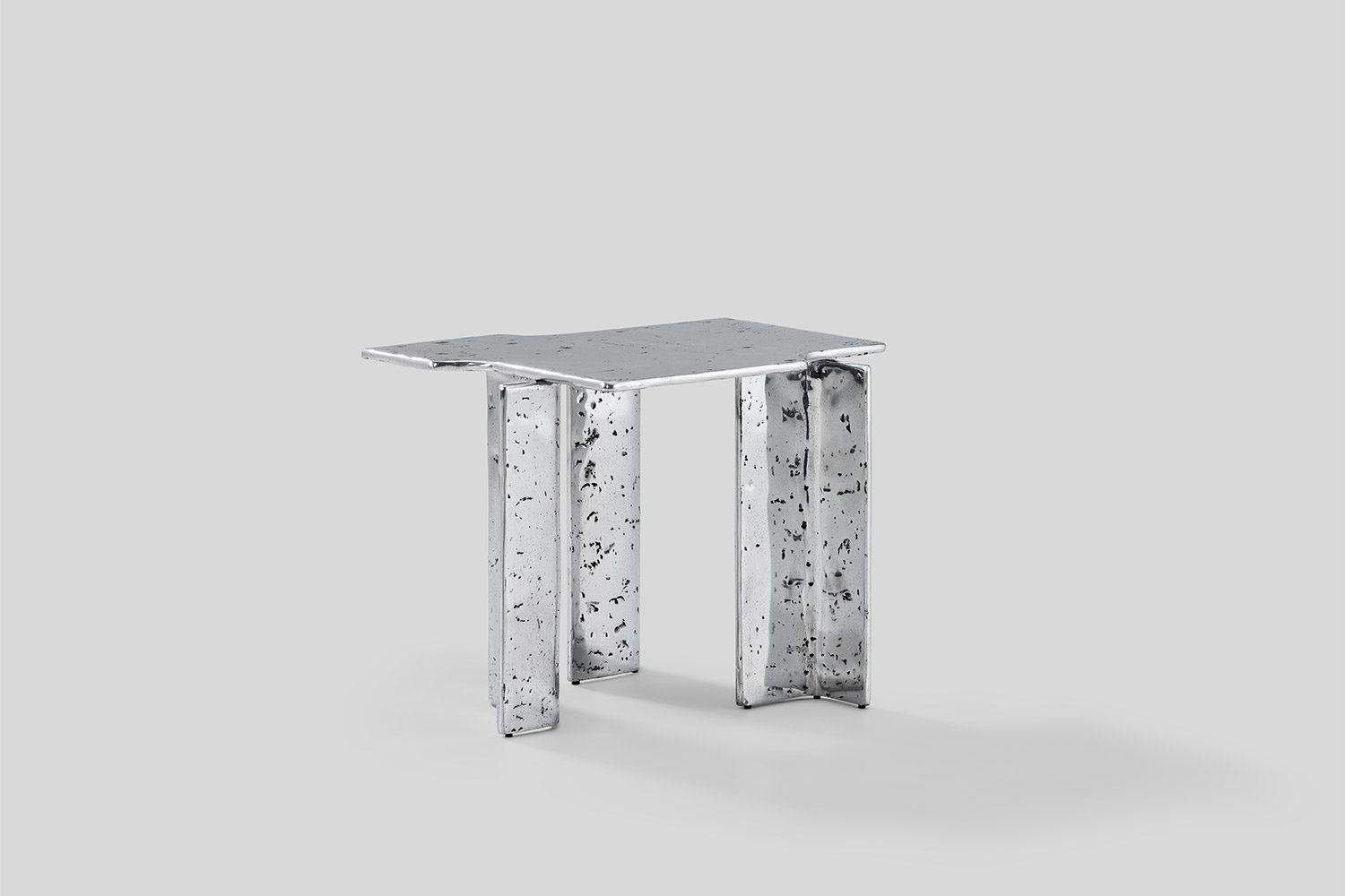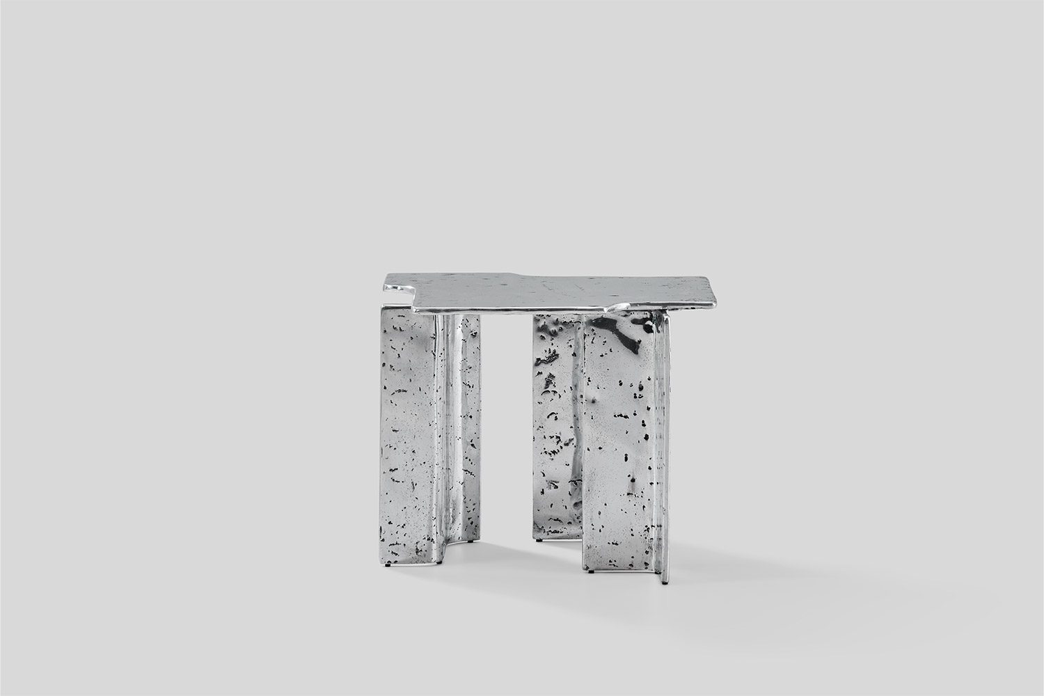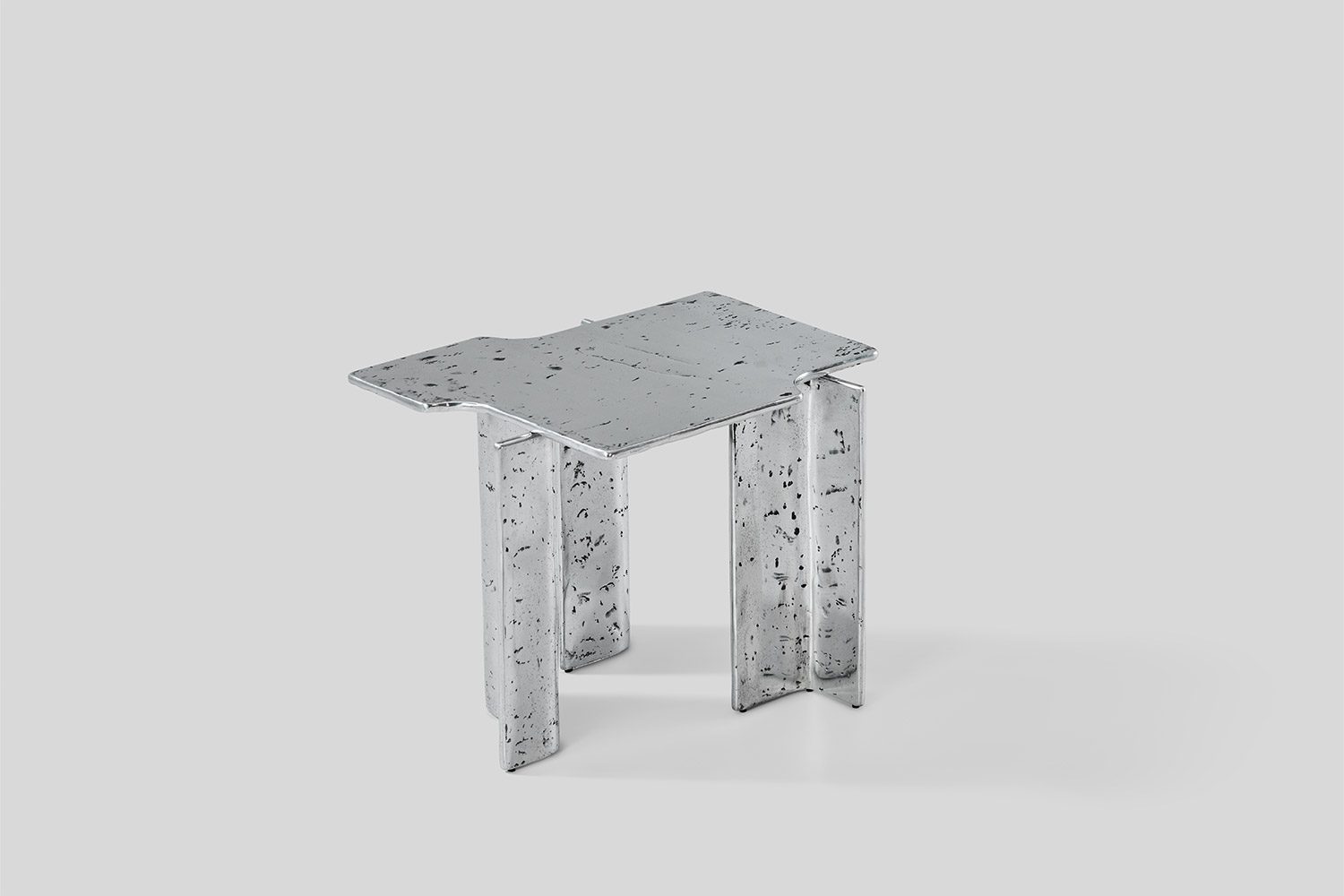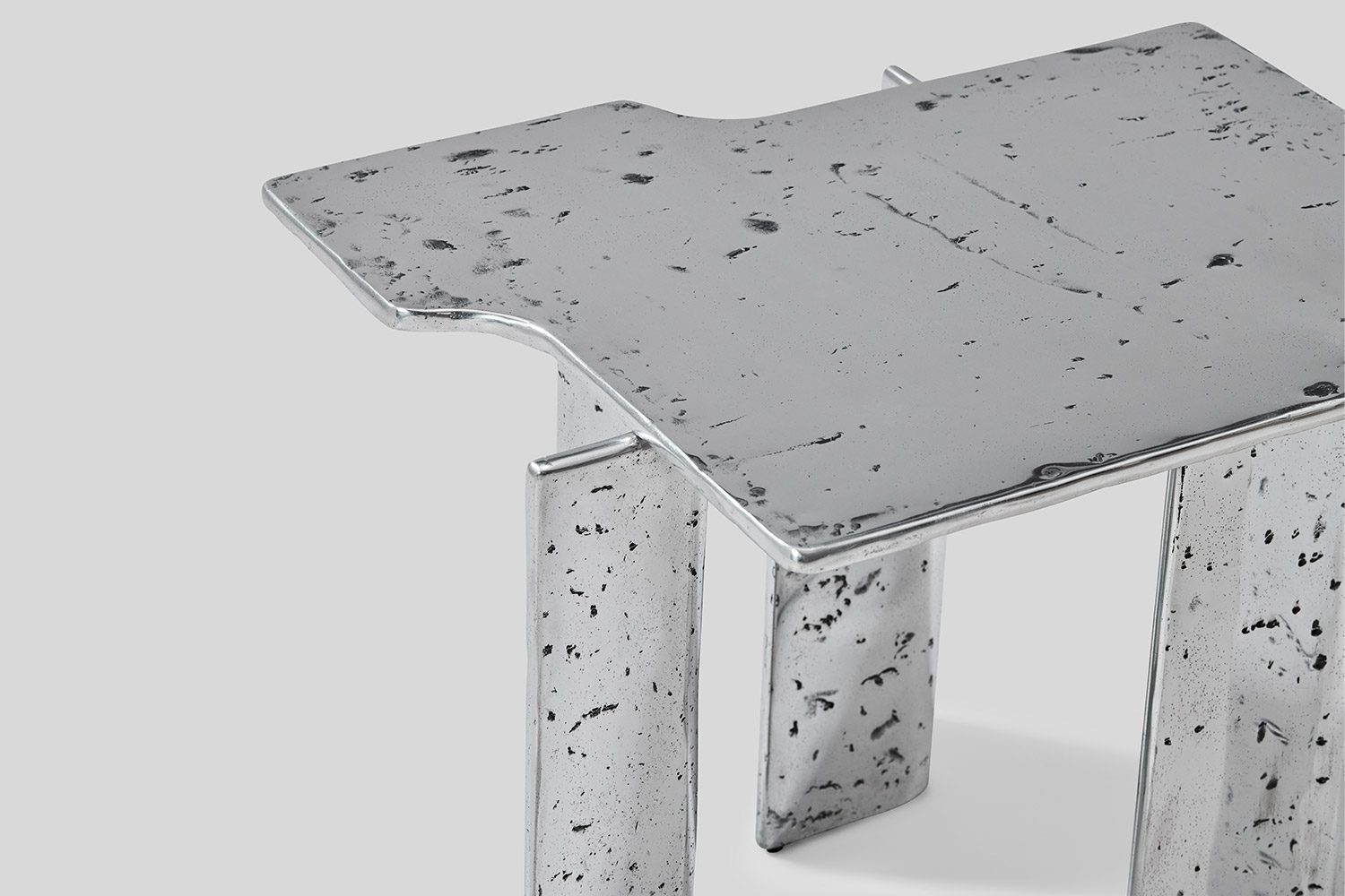 Metal comes to life as flat sheets bend, fold, and transform into fully cast tables, celebrating form, function, and material ingenuity. The raw texture of the metal is preserved, yet the surfaces are smooth to the touch, creating a tactile contrast that enhances the visual depth. Edges, folds, and angles cast dynamic shadows, turning simplicity into elegant, functional art. These tables embody contemporary craftsmanship, where raw material and refined design converge in a statement of sculptural sophistication.