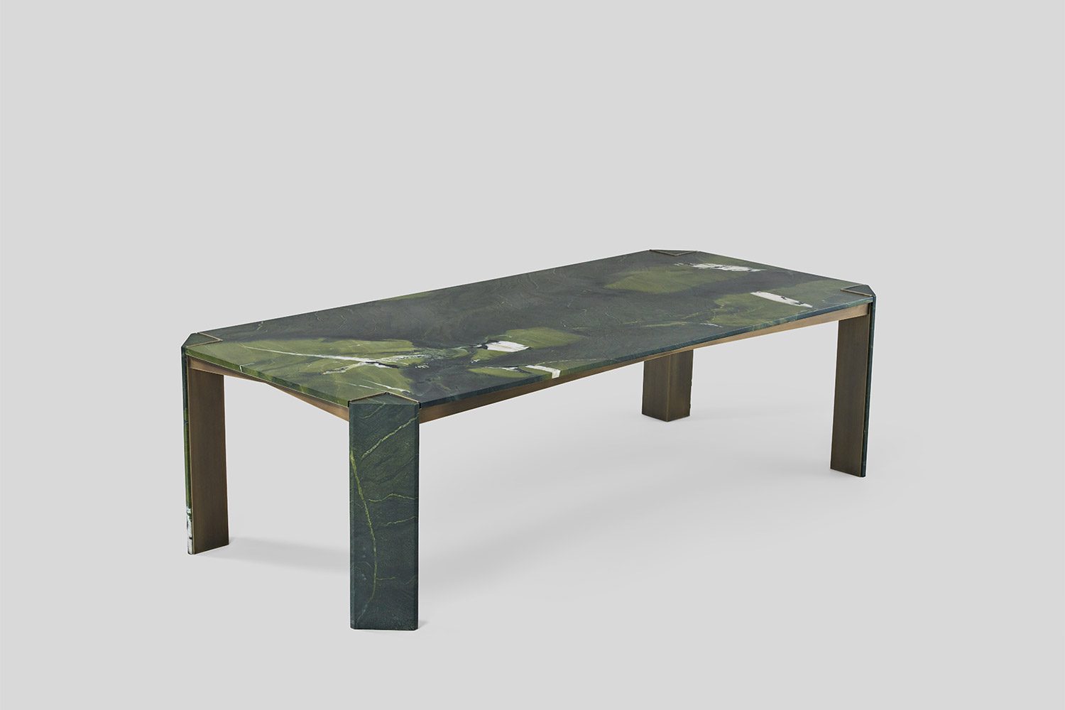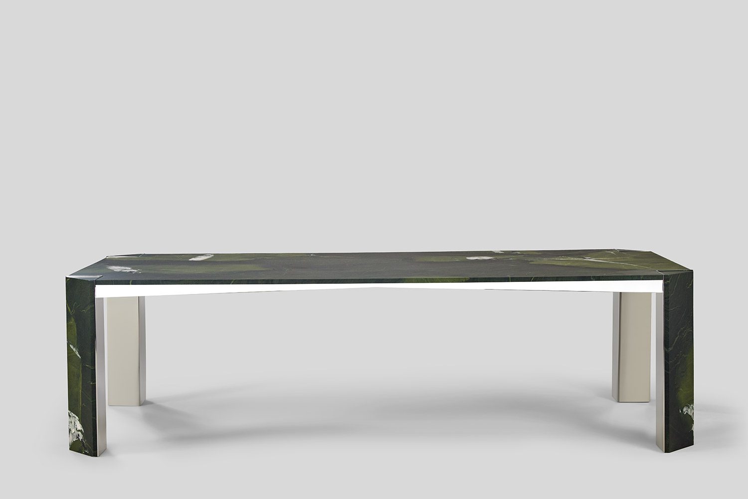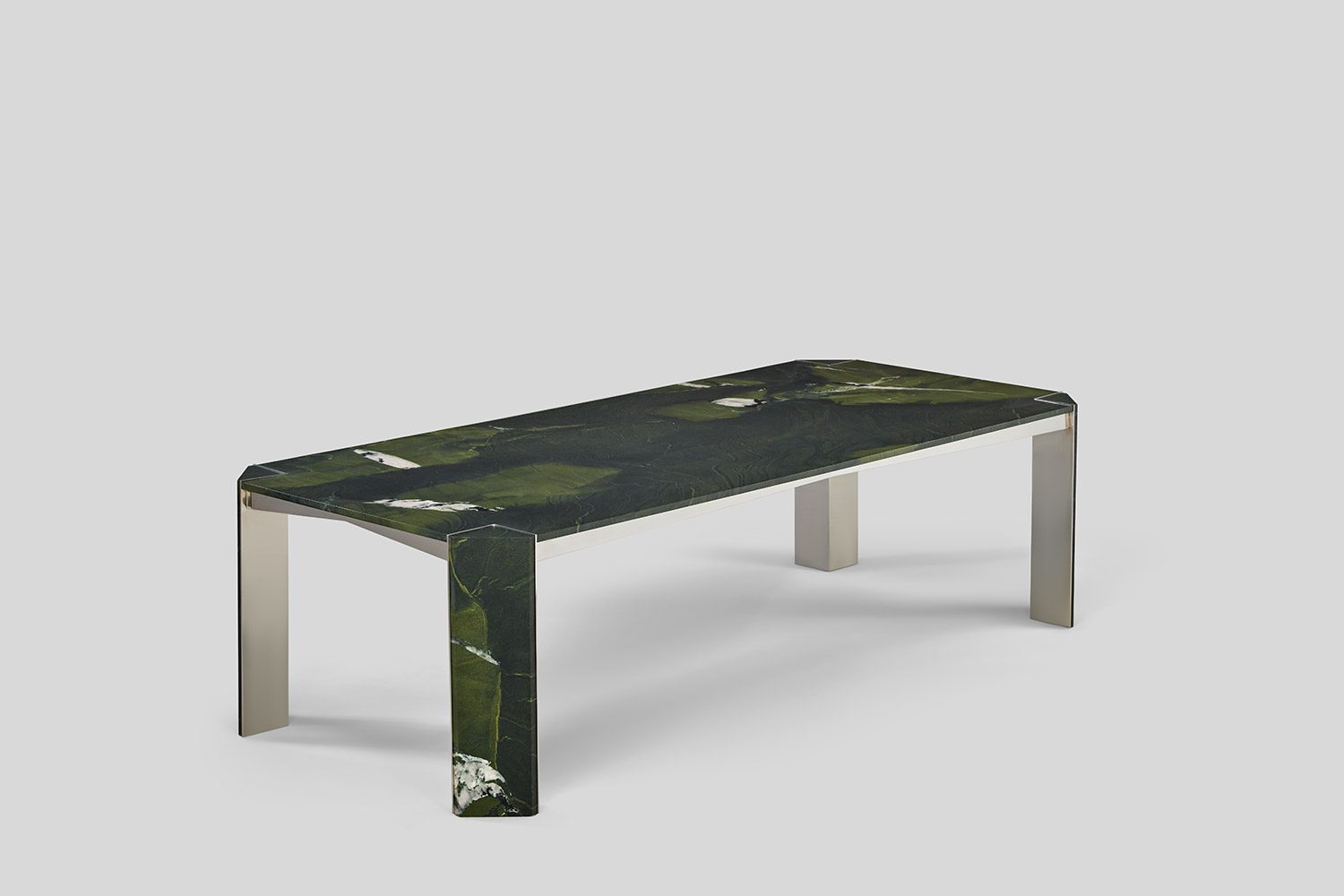 This collection is conceived to maximize functionality while maintaining a clean and refined look. The tabletop is proportioned to offer generous, uninterrupted surface area, ensuring optimal usability without visual bulk. Slim, subtly positioned corner legs provide structural support while remaining understated, allowing the form to feel light and balanced. The combination of stone and metal creates a dialogue between solidity and precision, the natural richness of the stone complemented by the crisp clarity of the metal framework. Carefully detailed edges and seamless material transitions enhance the overall elegance, resulting in a table that feels efficient, composed, and timeless in character.