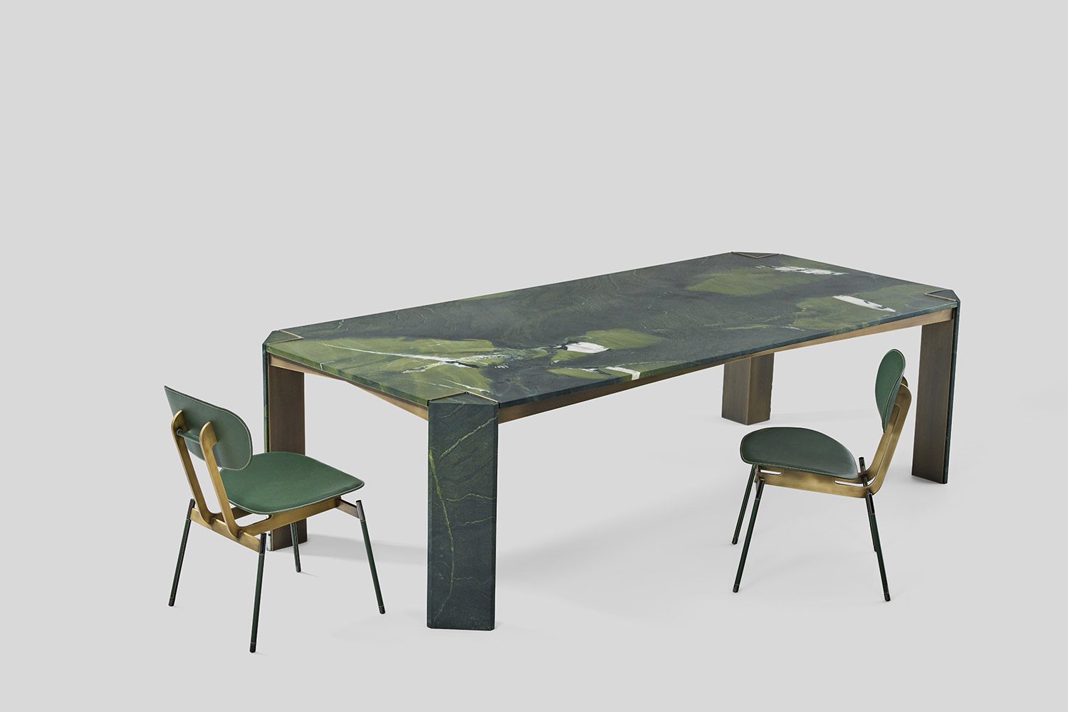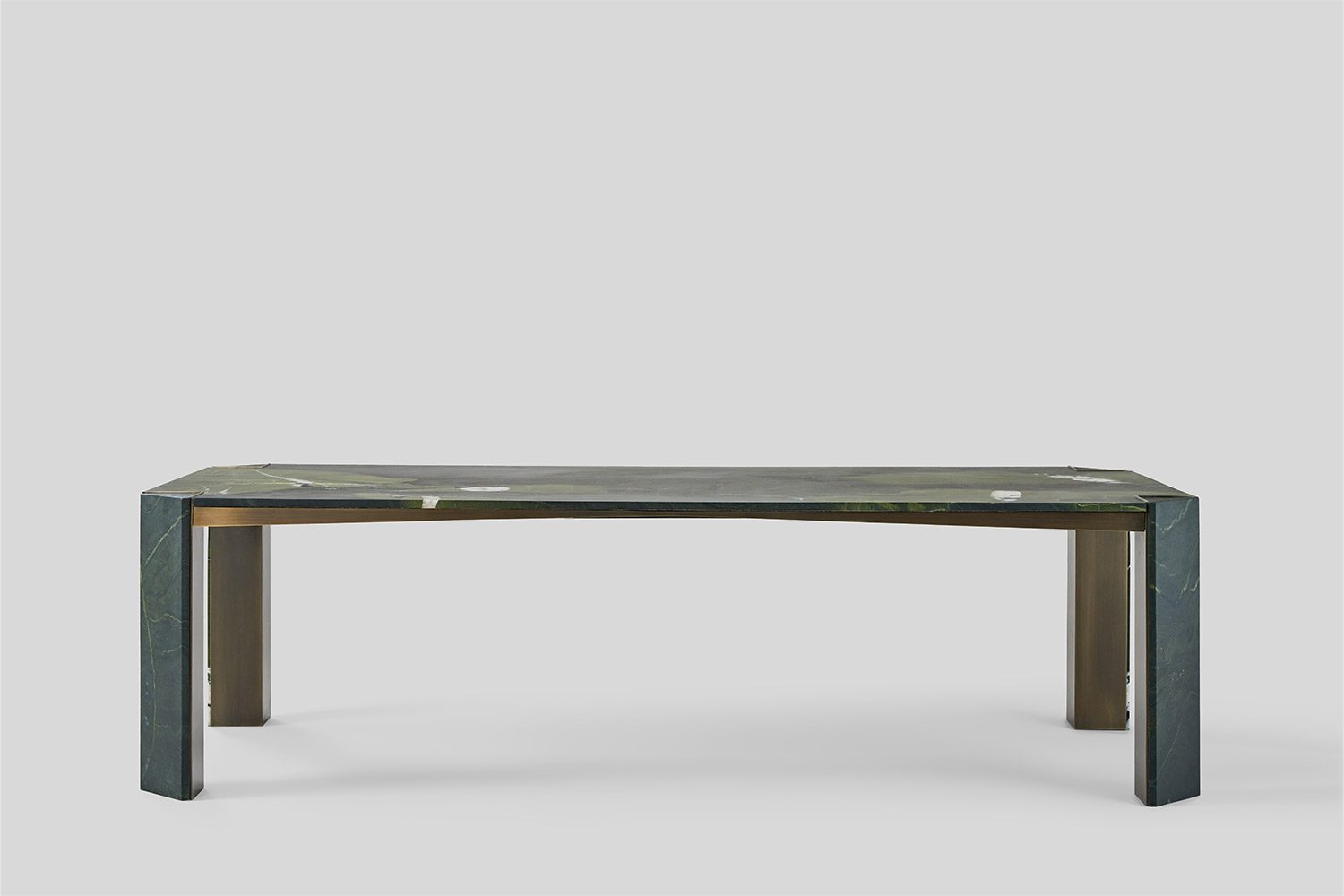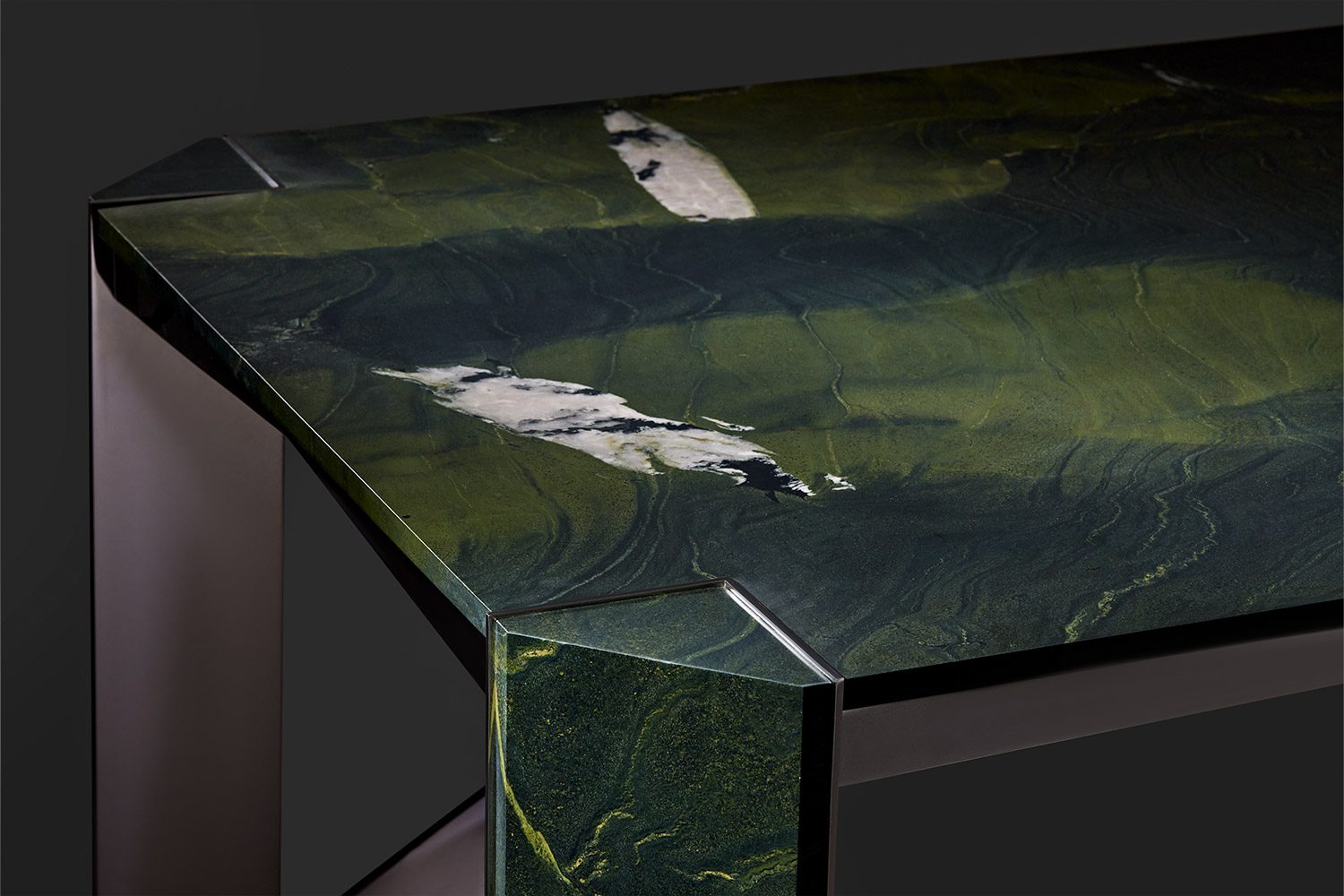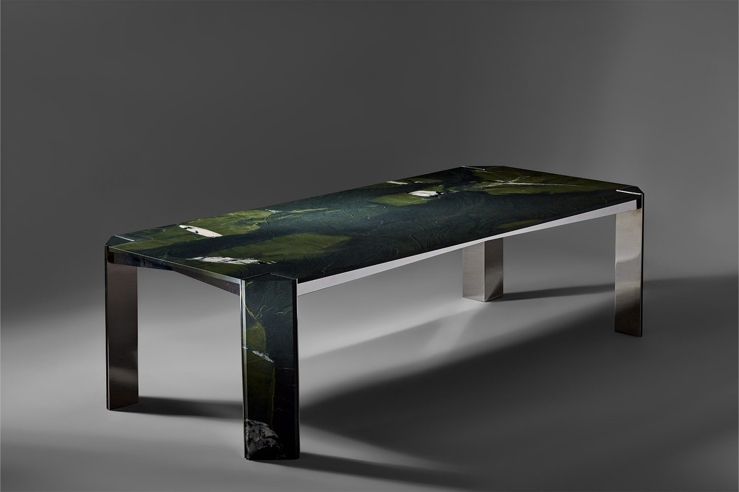 This collection is conceived to maximize functionality while maintaining a clean and refined look. The tabletop is proportioned to offer generous, uninterrupted surface area, ensuring optimal usability without visual bulk. Slim, subtly positioned corner legs provide structural support while remaining understated, allowing the form to feel light and balanced. The combination of stone and metal creates a dialogue between solidity and precision, the natural richness of the stone complemented by the crisp clarity of the metal framework. Carefully detailed edges and seamless material transitions enhance the overall elegance, resulting in a table that feels efficient, composed, and timeless in character.