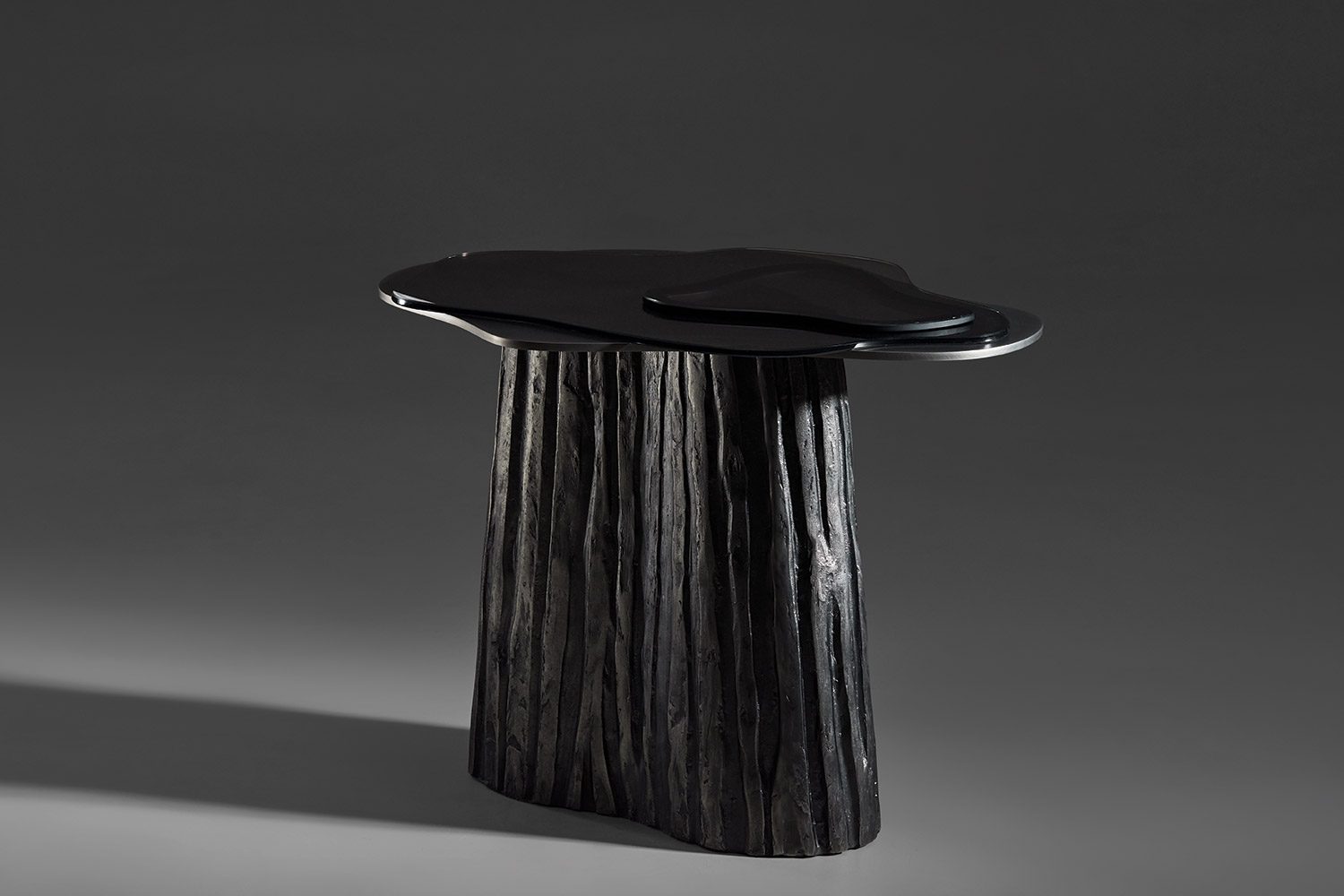 This collection is shaped by the idea of contouring and visual layering, where surfaces overlap and reveal one another through controlled transparency. The tops are formed in tinted glass, cut in fluid profiles that create depth and shifting reflections as they stack. Beneath them, heavily textured cast metal bases echo the rugged character of a carved tree trunk, grounding the pieces with weight and tactility. The contrast between the raw, bark like metal and the smooth, translucent glass creates a dialogue between opacity and lightness. Each piece reads as both geological and refined, solid at its core, yet visually permeable.