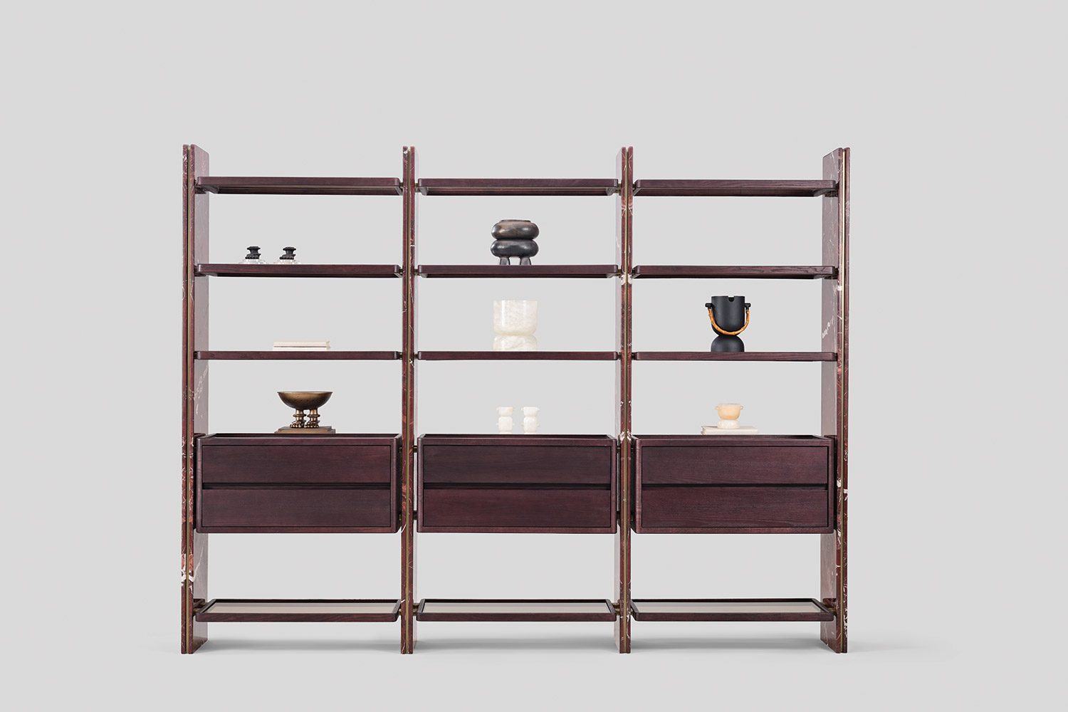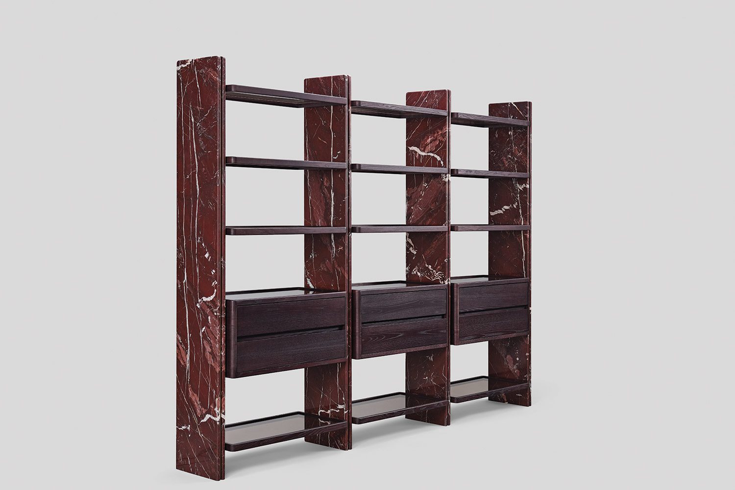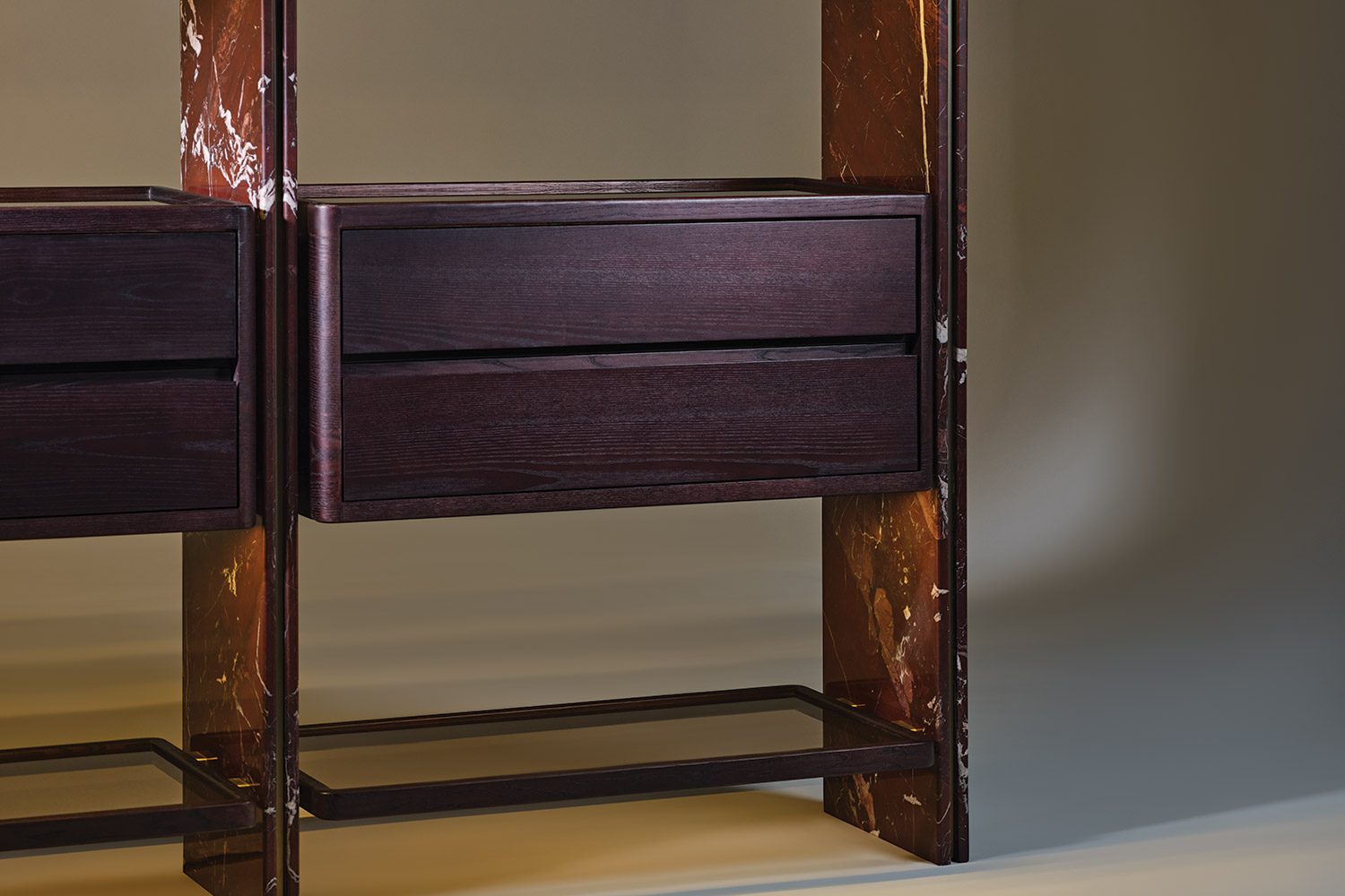 Suspended between these panels are wood-framed glass shelves that introduce transparency and visual lightness, allowing displayed objects to remain the focal point. The composition is complemented by floating drawer units in wood with glass tops, revealing the internal organization and adding a subtle layer of craftsmanship to the design.