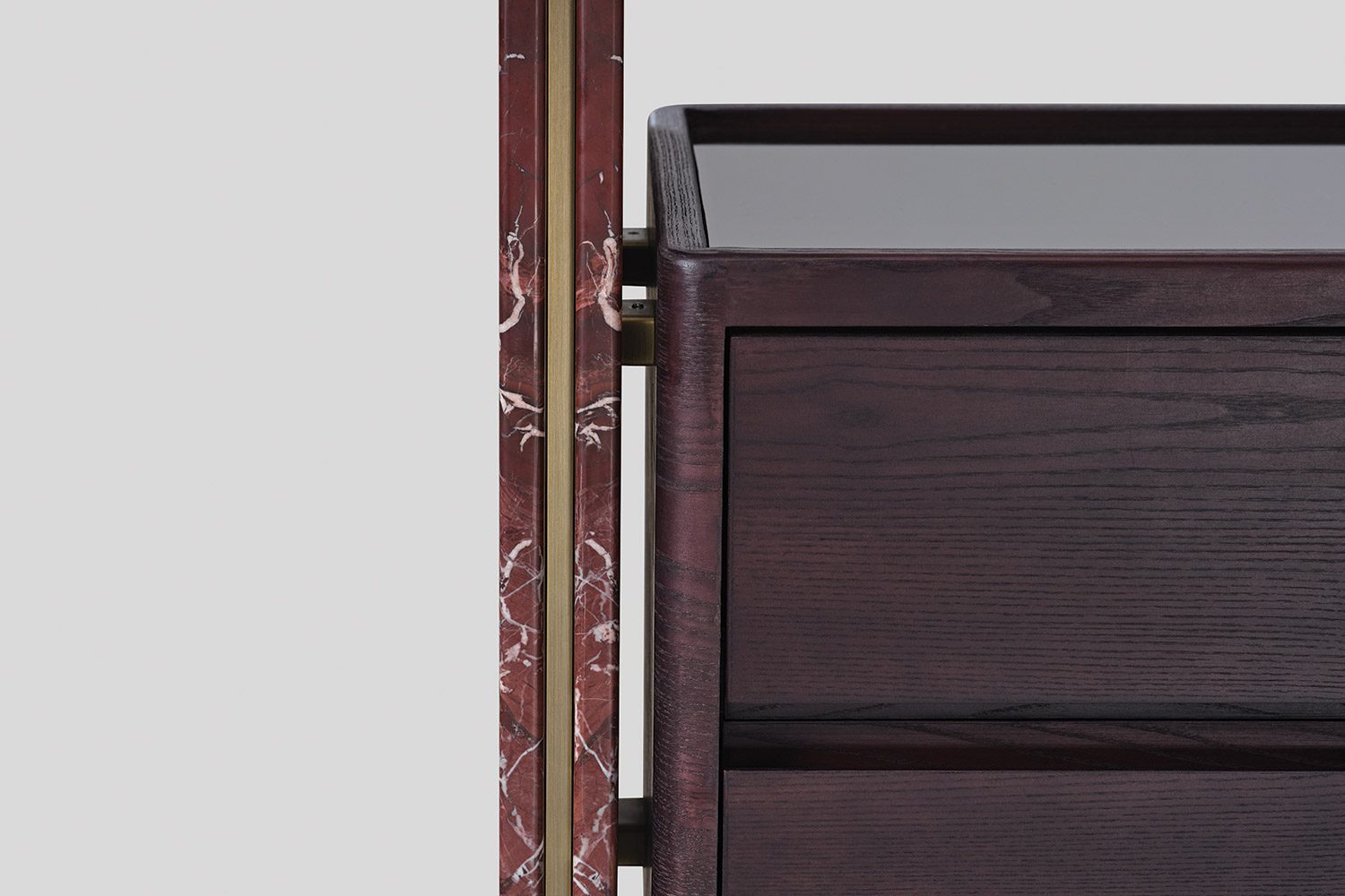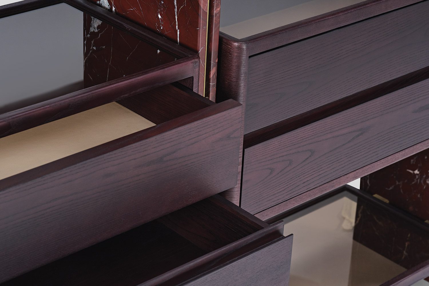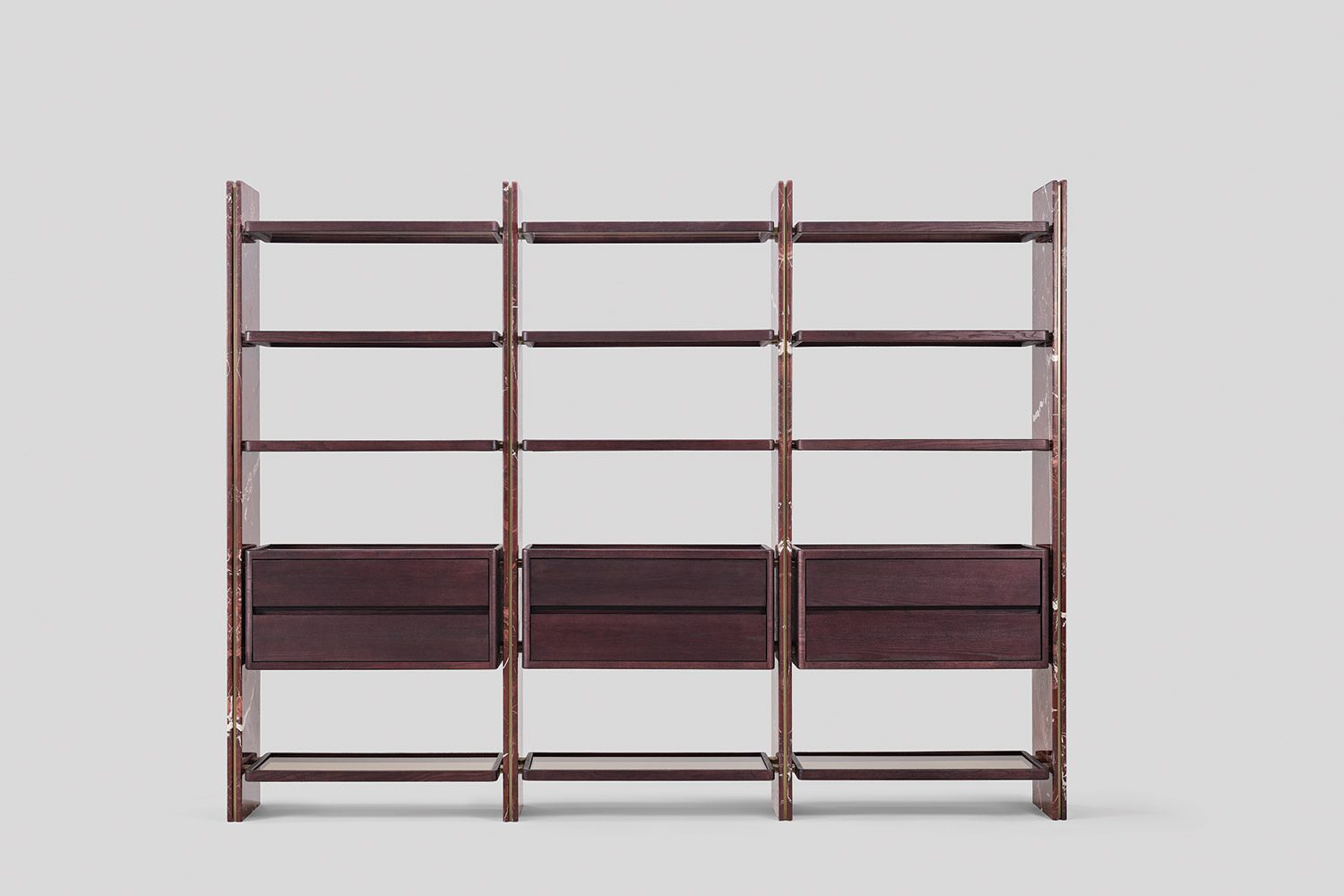 Suspended between these panels are wood-framed glass shelves that introduce transparency and visual lightness, allowing displayed objects to remain the focal point. The composition is complemented by floating drawer units in wood with glass tops, revealing the internal organization and adding a subtle layer of craftsmanship to the design.