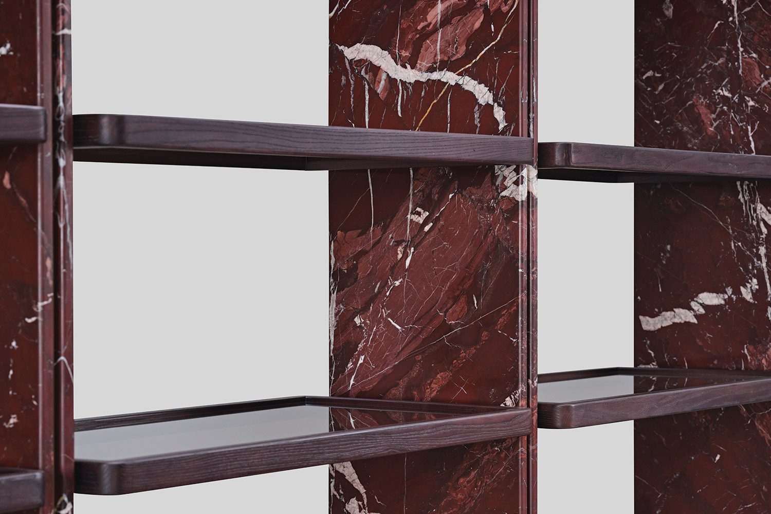 The Nexa Shelving Unit is designed as a refined composition of stone, wood, glass, and light. Vertical stone panels form the structural framework of the system, accentuated by a slim metal layer sandwiched within the material, highlighting the precision of the construction while celebrating the natural character of the stone.