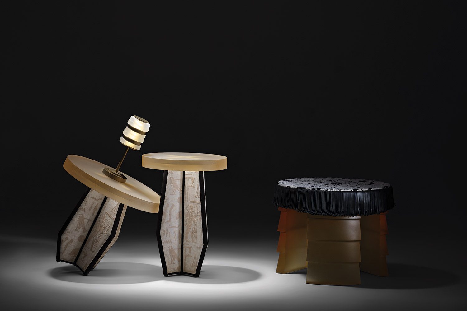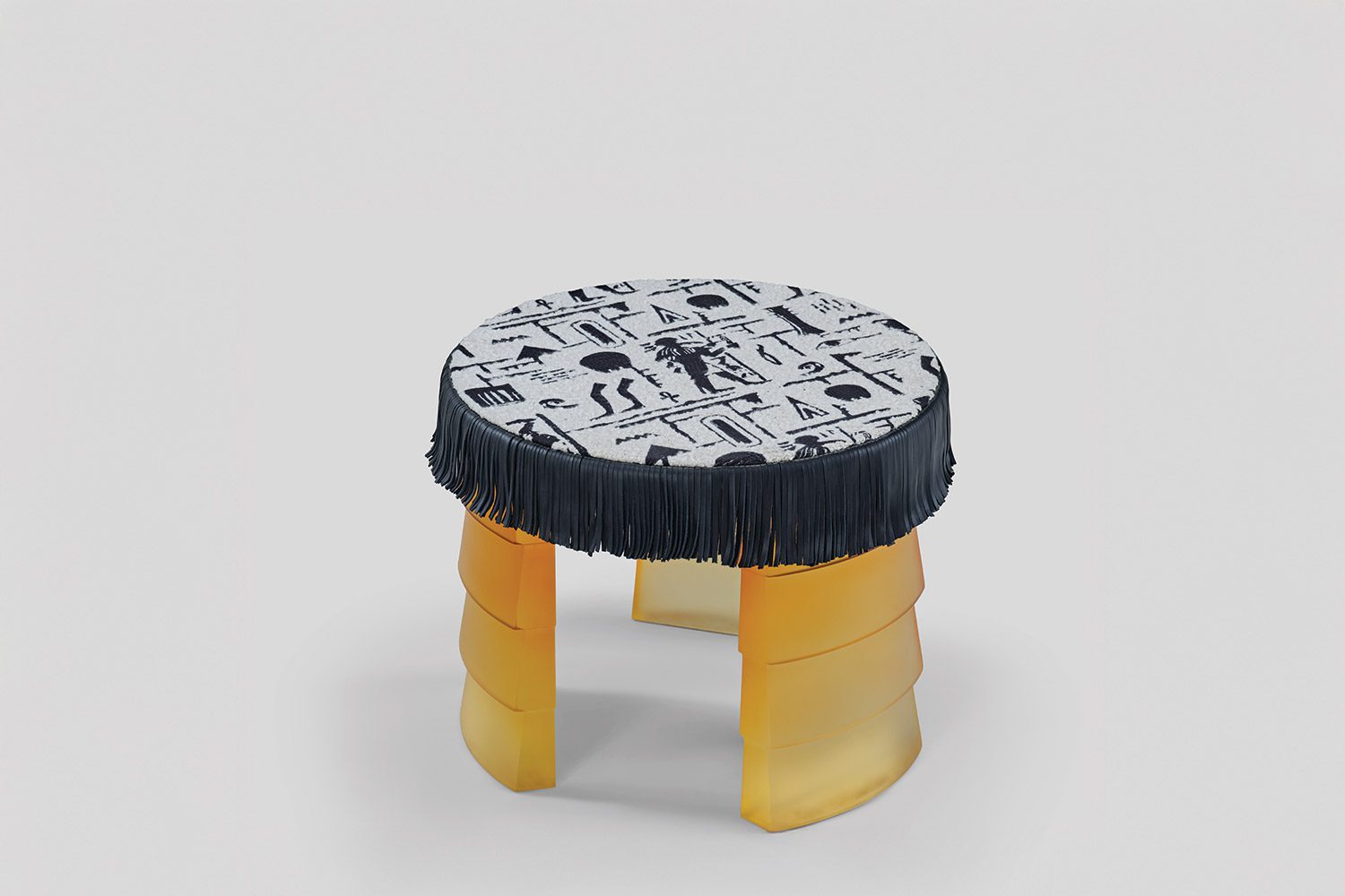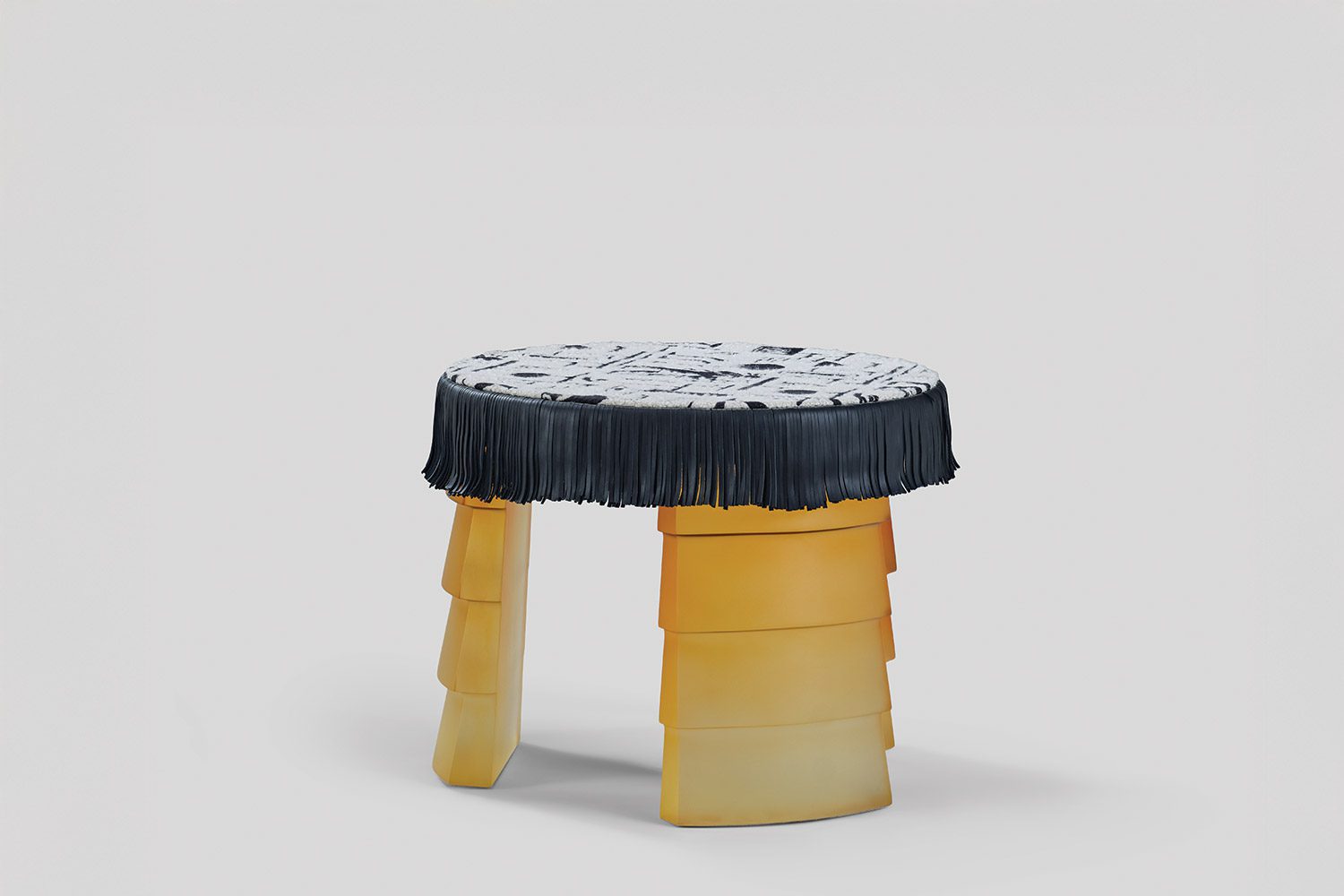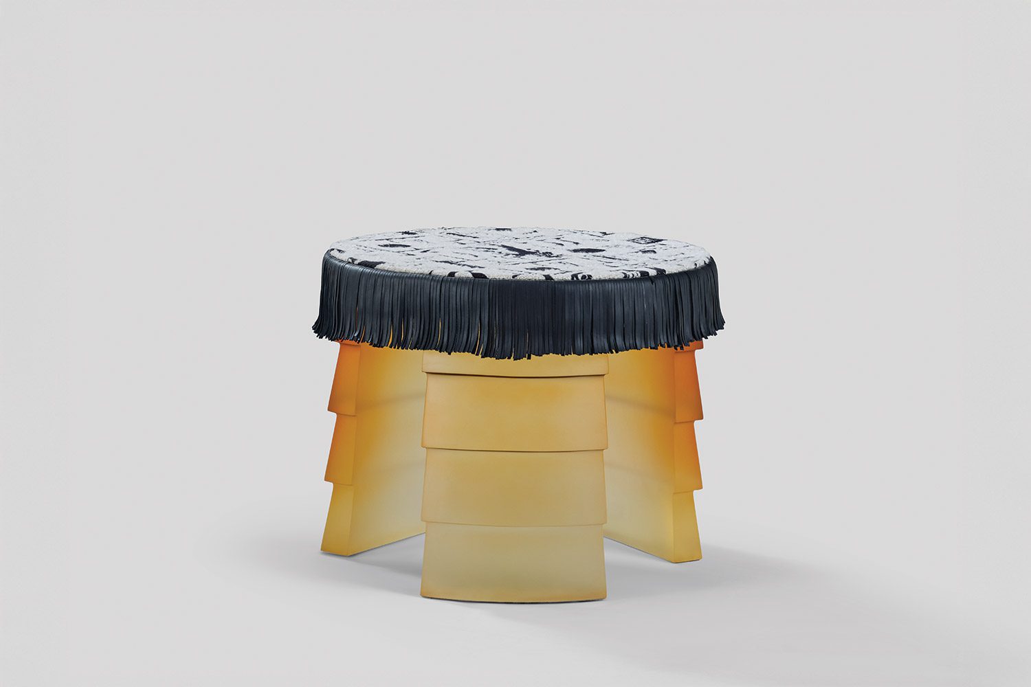 Cast in an ombré gradient, the resin shifts subtly in tone, adding depth and movement as light passes through the form. On the seat, a fabric top softens the composition, with frilled edges introducing tactility and a gentle counterpoint to the geometric base.