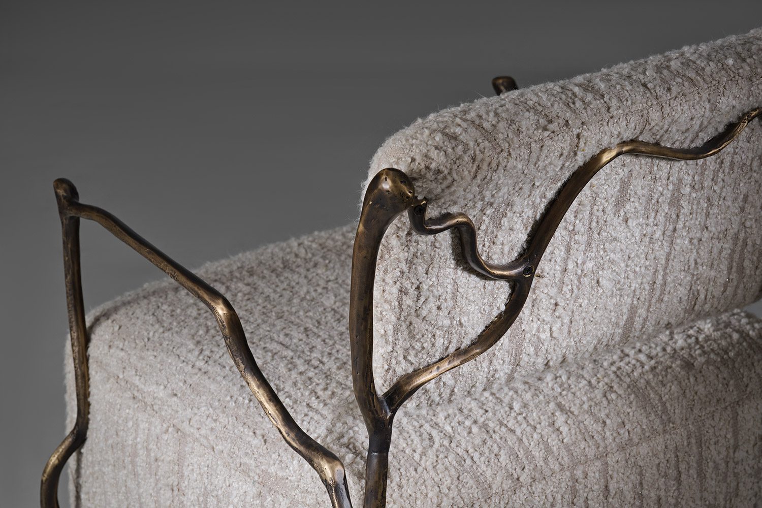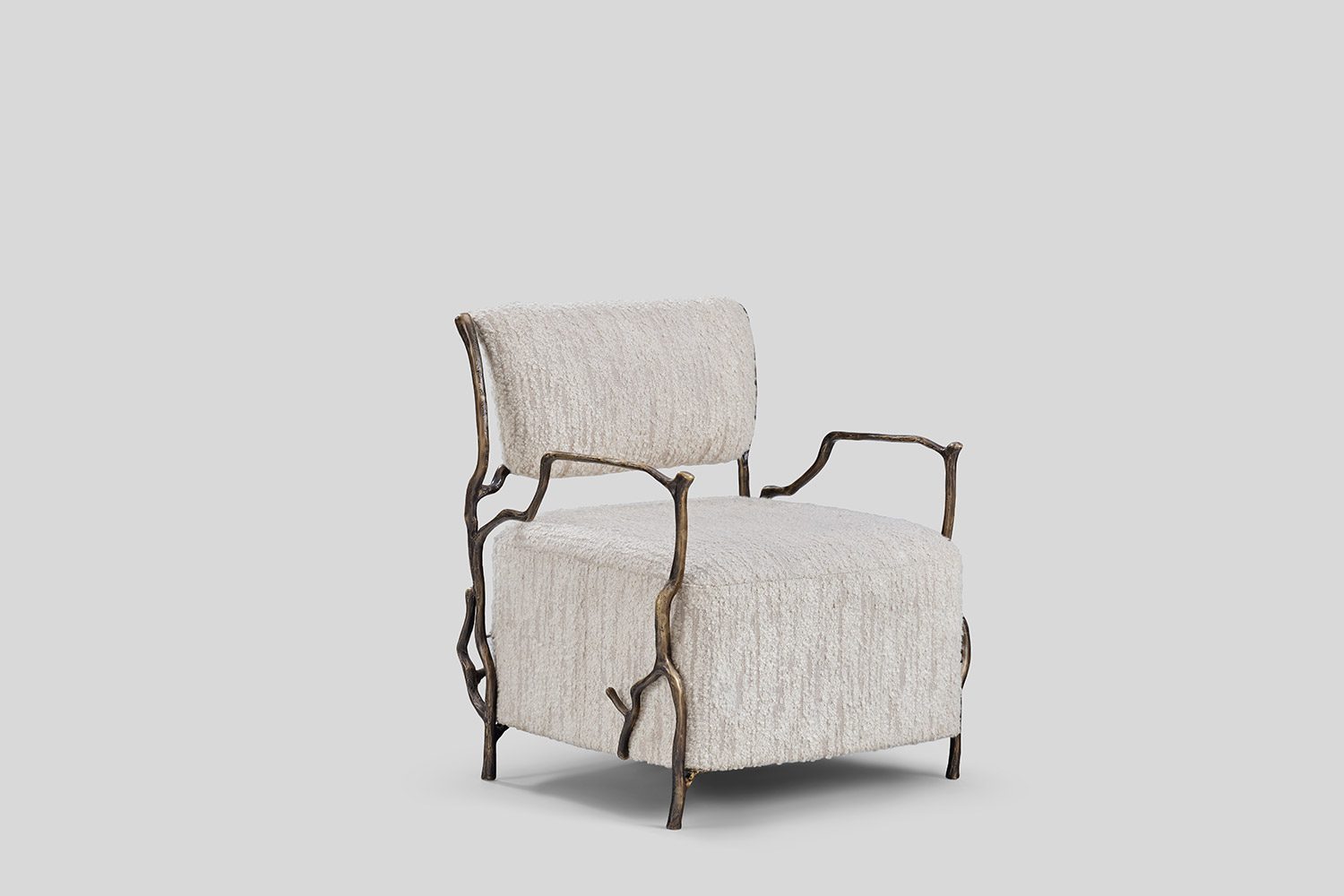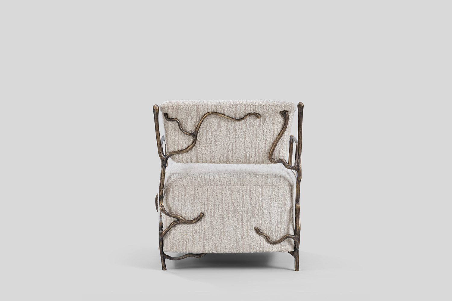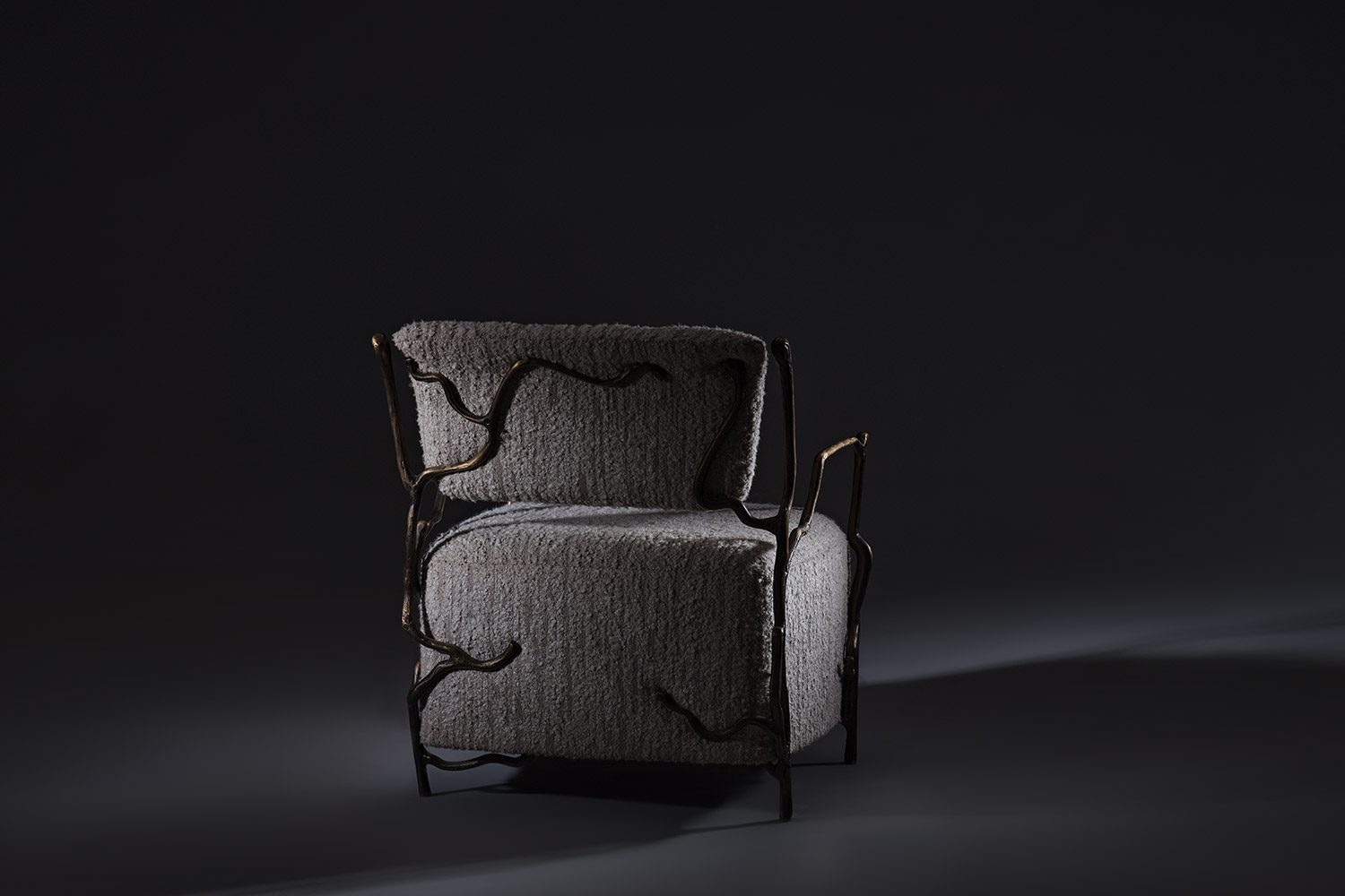 Inspired by the quiet intelligence of branching trees, this lounge chair translates organic growth into sculptural form. A cast metal framework unfolds like intertwined stems, creating a fluid structural network that supports the seat and backrest. The upholstered volumes sit gently within this branching frame, introducing softness and comfort against the expressive metal structure. Subtle irregularities, soft transitions, and rhythmic lines echo the natural patterns of growth found in tree limbs. The chair balances structure with ease, transforming a natural phenomenon into a functional object. The result is a piece that merges craft, comfort, and nature—expressive in form yet calm in presence.