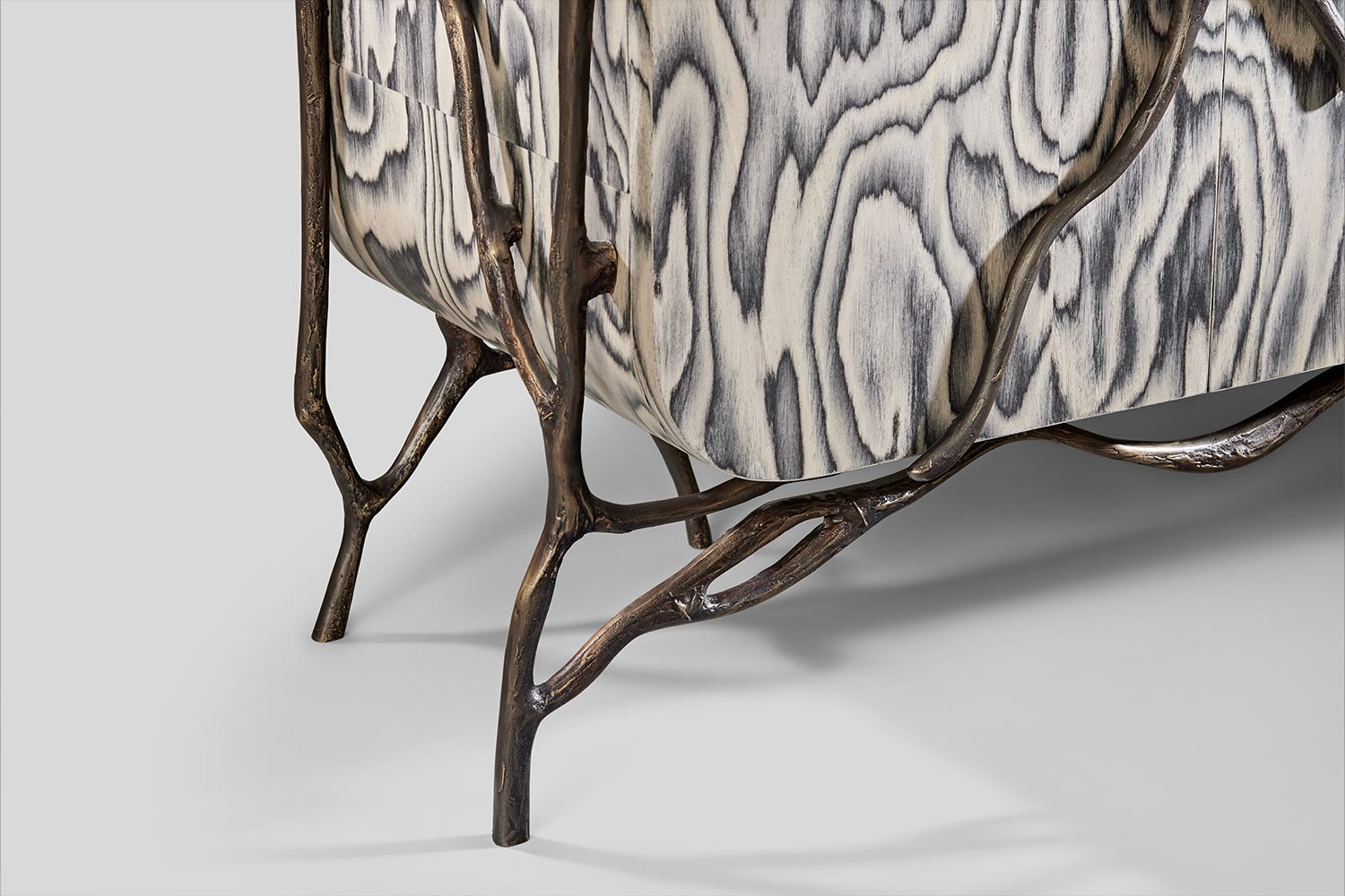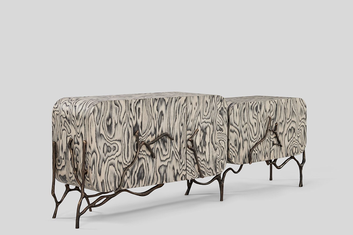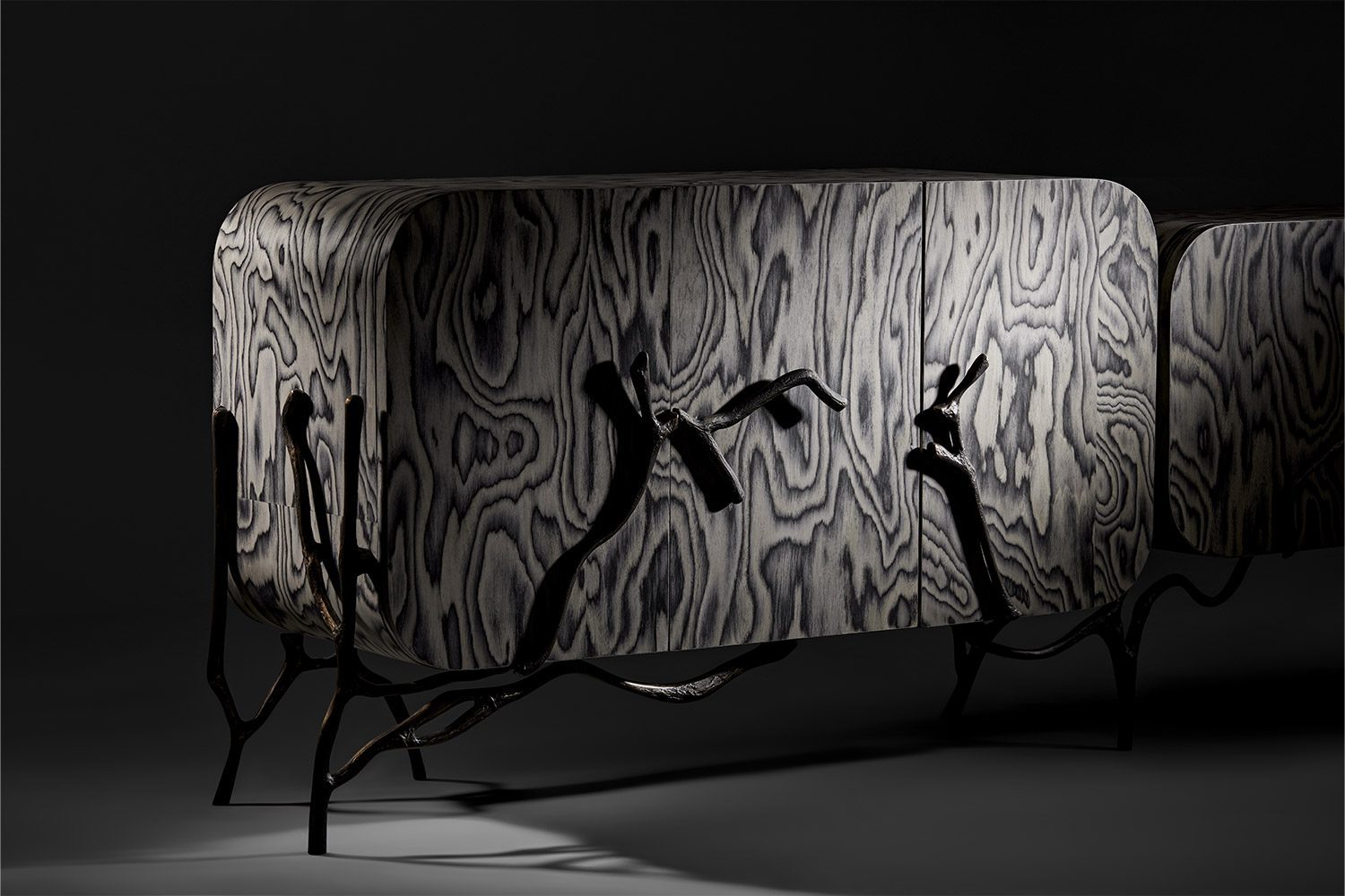 This furniture series draws its character from the quiet intelligence of branching trees. The cast metal framework flows like intertwined stems, creating a continuous support system that feels alive and in motion. Veneer-clad volumes sit within this network like carved wooden cores, highlighting grain patterns and material depth. The pieces interpret the natural phenomenon of tree branching into a functional, sculptural language. Soft edges, irregular intersections, and rhythmic lines bring an organic calm to the forms. The result is a series that merges craft and nature—expressive, grounded, and quietly dramatic in presence.