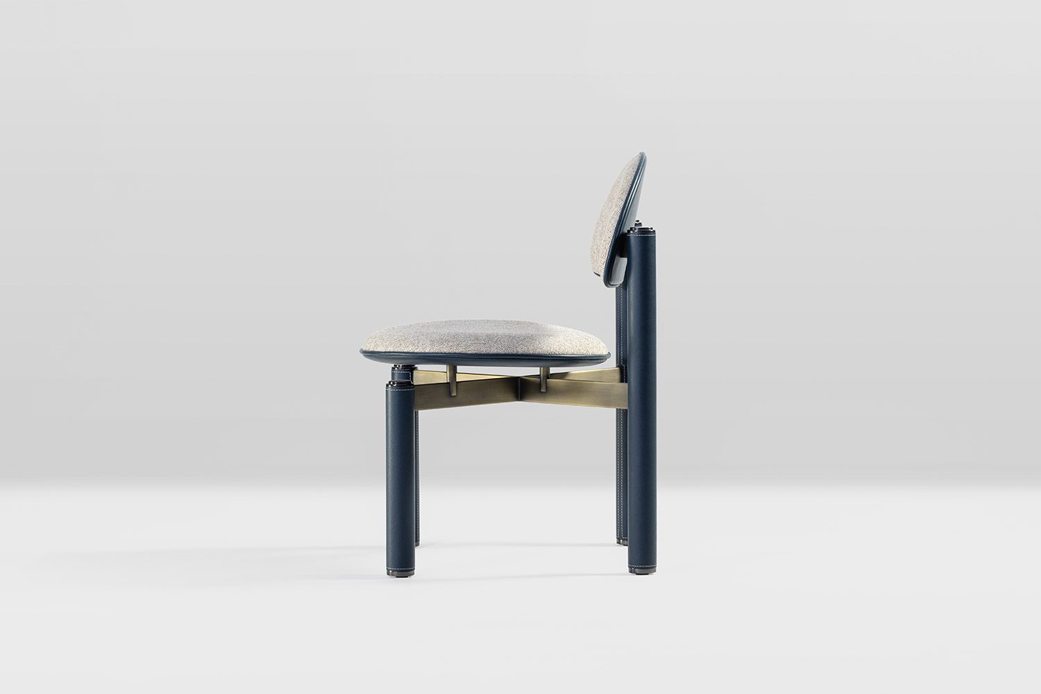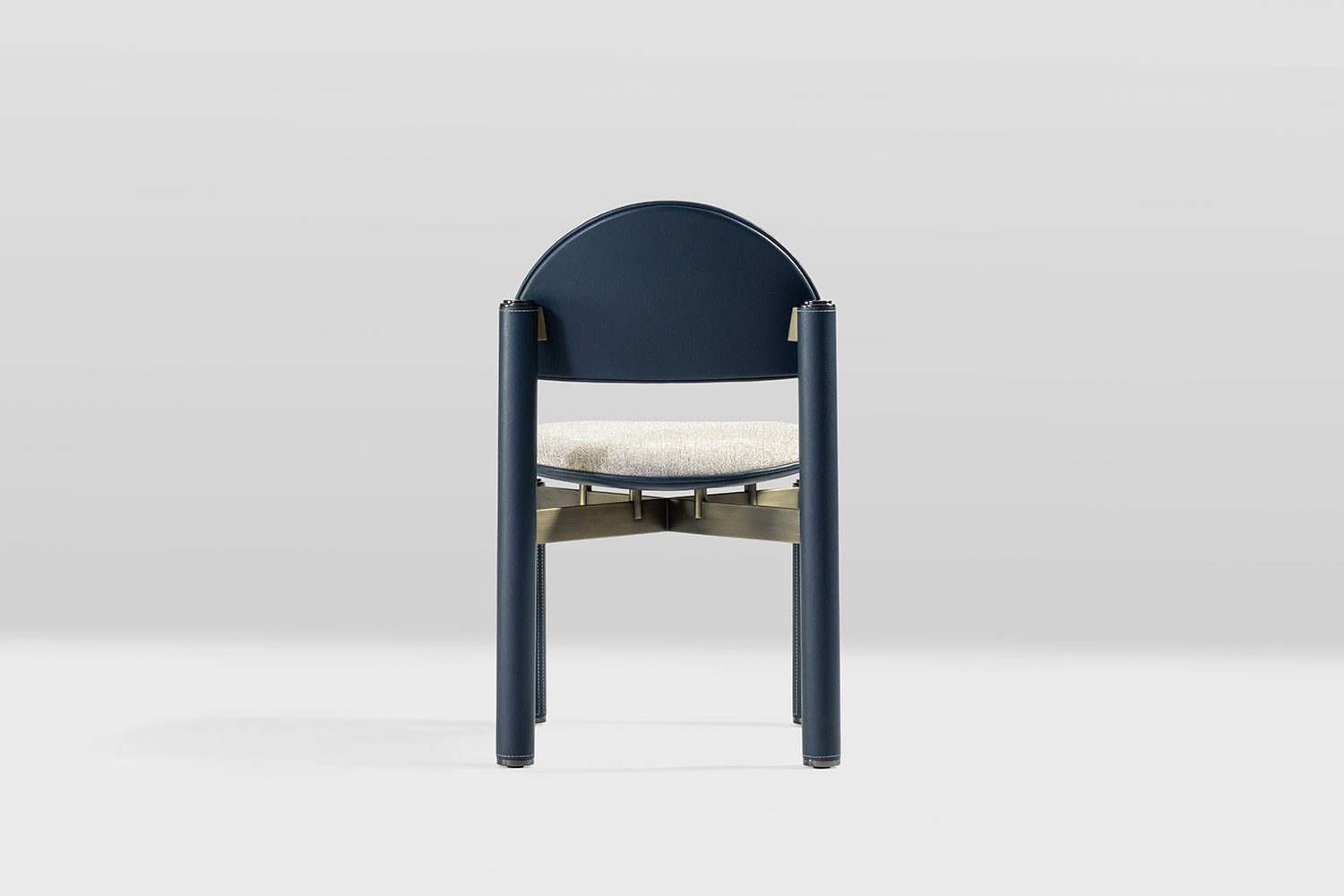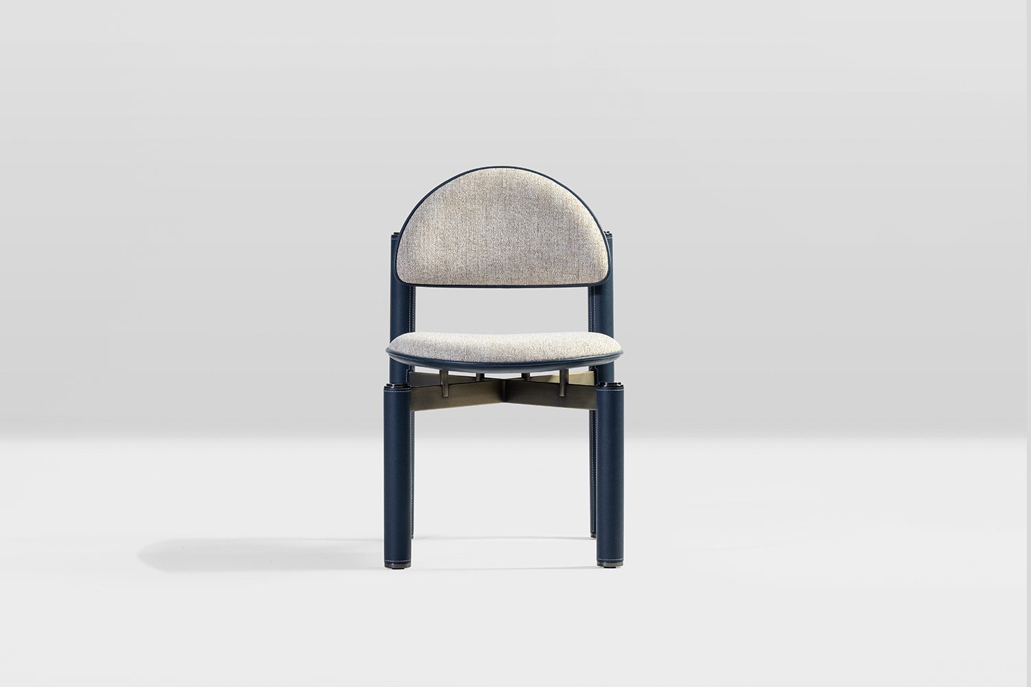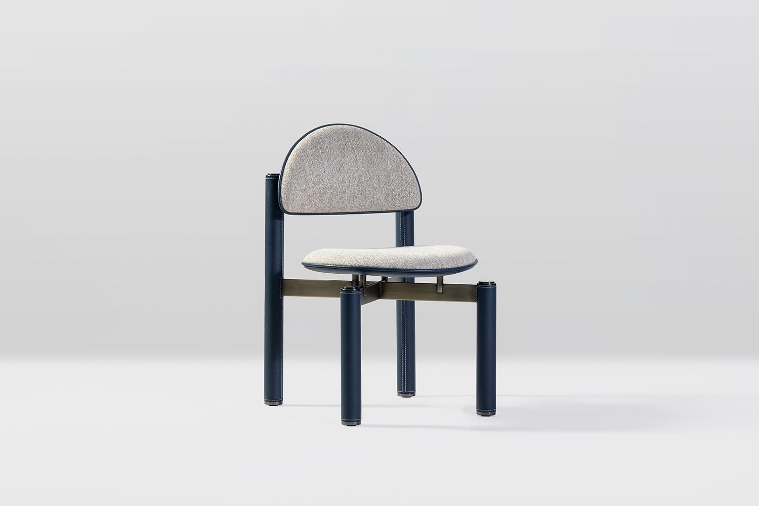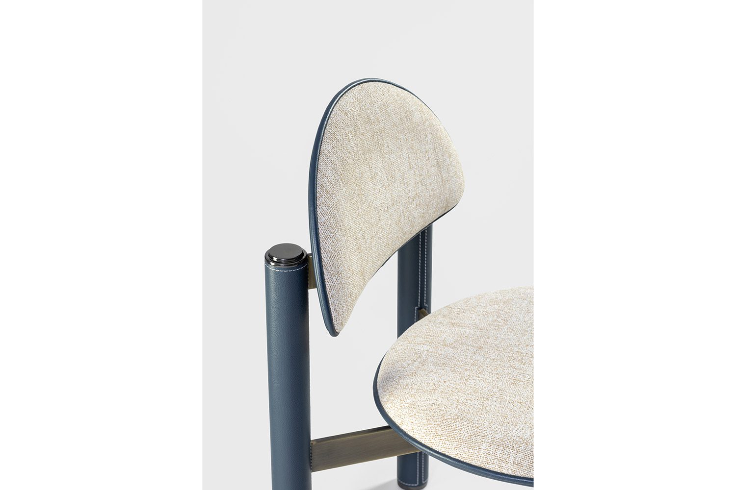 The Glide Chair is a functional and aesthetically pleasing addition that contributes to a more comfortable, stylish, and convenient dining or study experience. The elevated seat offers a perceived levitation while the seat and backrest combine the richness of eco leather and the softness of fabric by a leather piping detail adding an extra touch of refinement to this exquisite piece. Designed and engineered with meticulous attention to detail, the chair showcases an impeccable blend of premium materials.