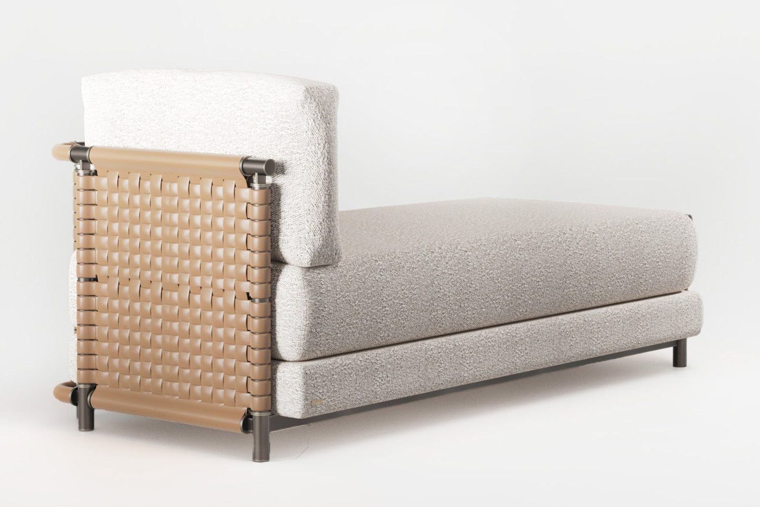 The Nesso Chaise is a striking addition to any living or loungr area, seamlessly merging structure with comfort. Handcrafted leather weave panels, made from premium full-grain leather, offer both visual appeal and structural support. These panels are intricately woven and integrated into a metal pipe framework, creating a strong yet open design. Metal strip junctions ensure precision, while the seating and cushions, upholstered in soft fabric, provide the perfect balance of rigidity and comfort. This fusion of craftsmanship, function, and tactile luxury makes Nesso a bold yet inviting centerpiece for your living space.