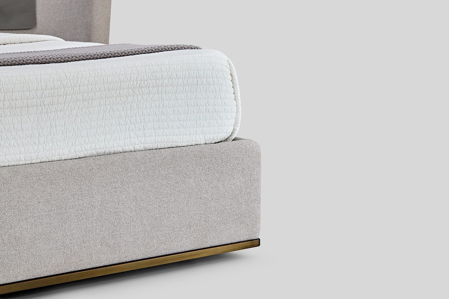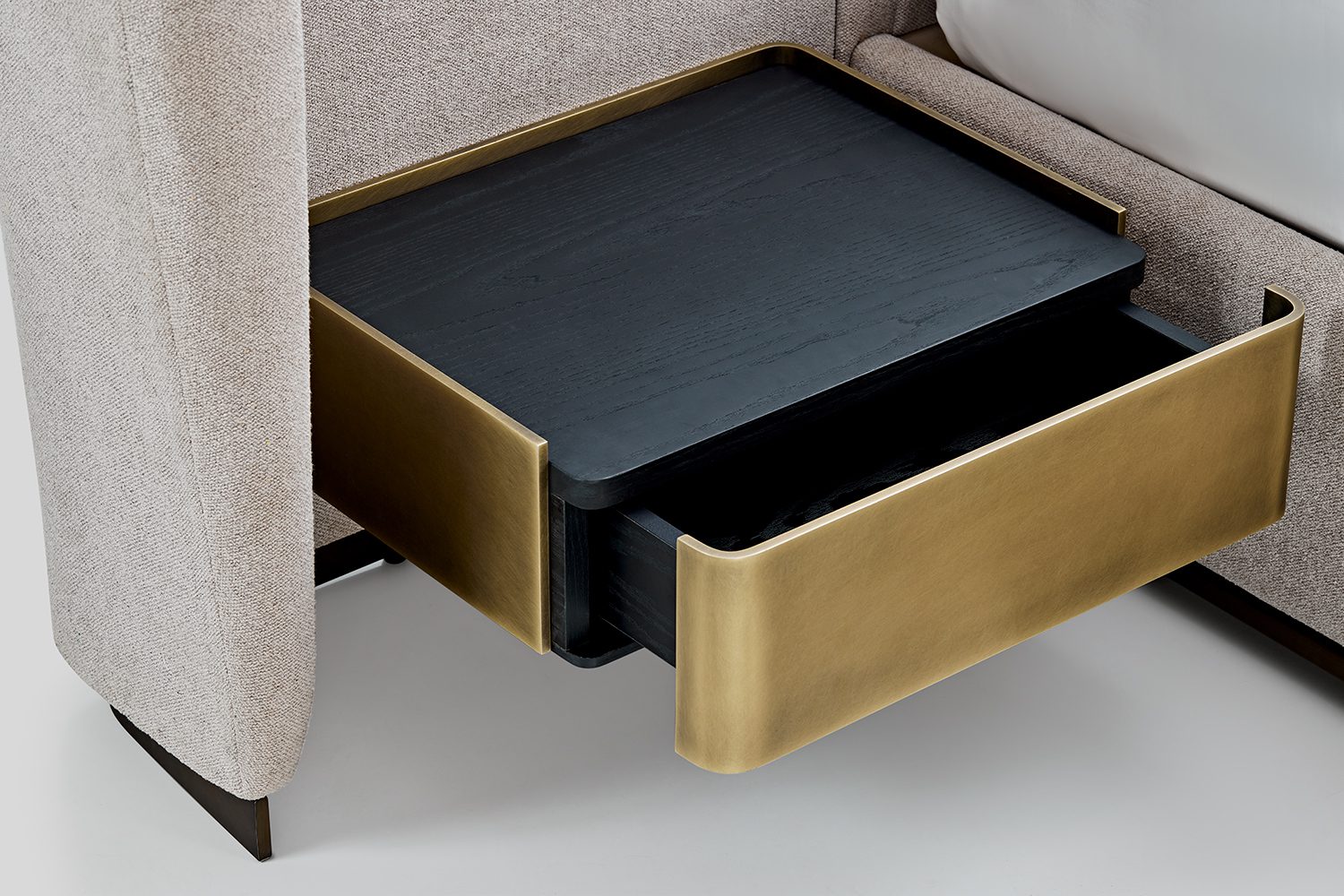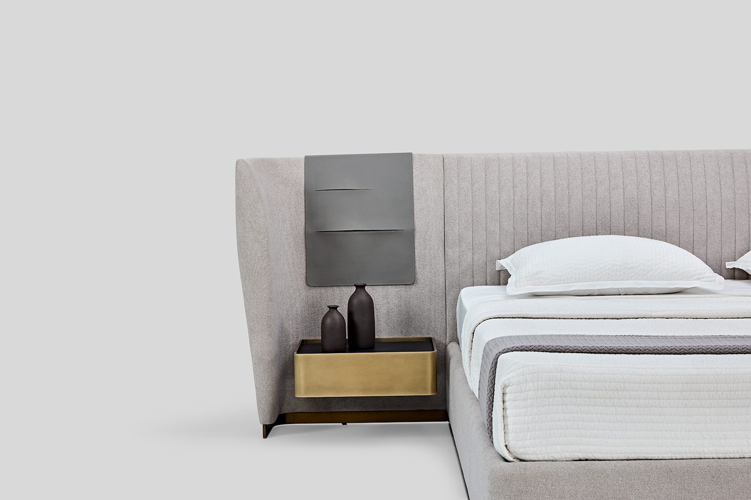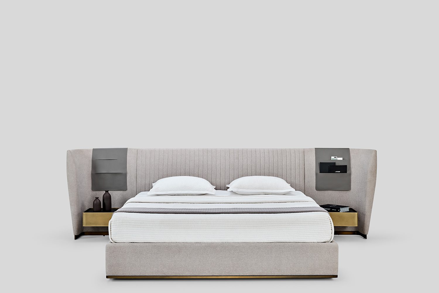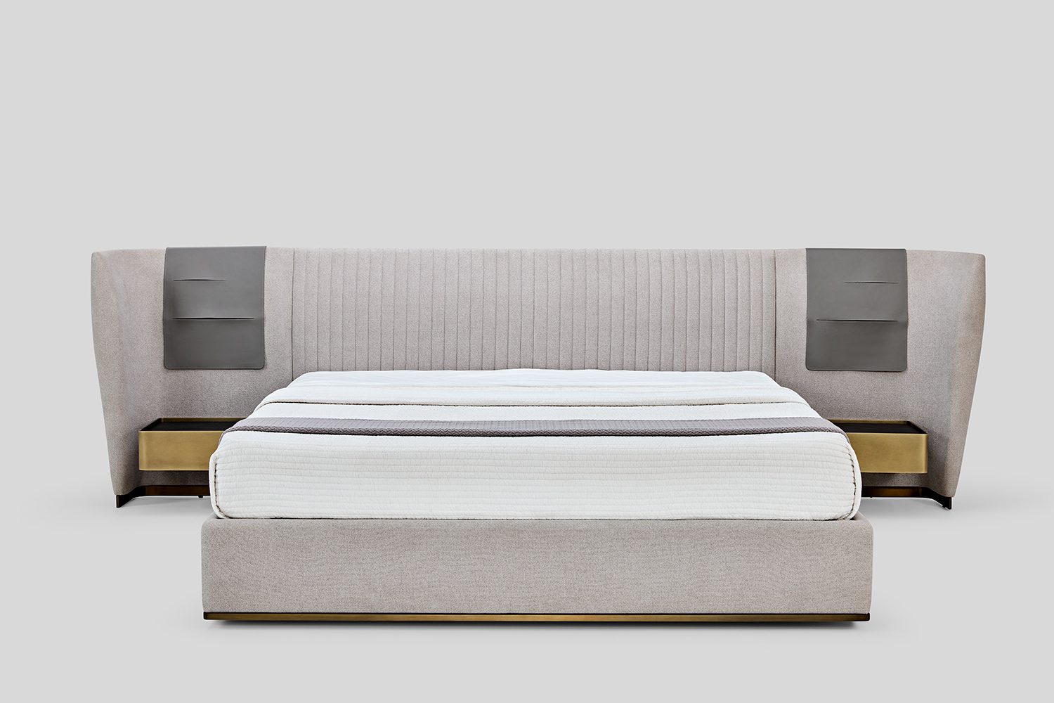 The Astor Alpha Bed evolves from the Astor bed, introducing a more elaborate and utilitarian design. While fully upholstered, its design integrates thoughtful features that respond to everyday living. The headboard upholstery is detailed with a ribbing design. Integrated leather pockets embed a practical storage element in the composition. On either side of the bed, reading lights are incorporated into the structure. Completing the ensemble are inbuilt bedside tables with a cantilevered design.