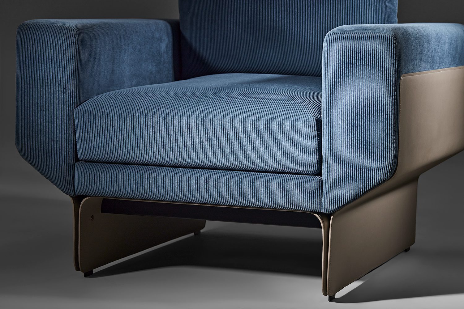 The Adler Series offers two variants, one featuring metal arms and legs, and theother showcasing the same details in leather with intricate stitching accents. Both options offer an integration of materials, as leather or metal wraps around the upholstered arms and extends to form the legs, creating a cohesive look. The thin fold of leather or metal on the outside adds a subtle detail to the design. Additionally, the Adler Sofa also comes with a module equipped with a leather tray, enhancing its functionality and versatility.