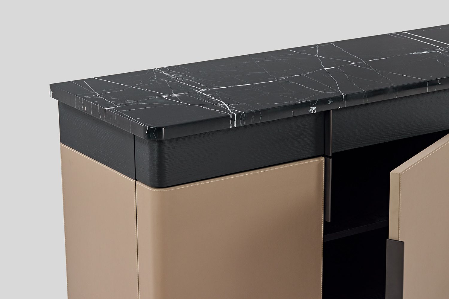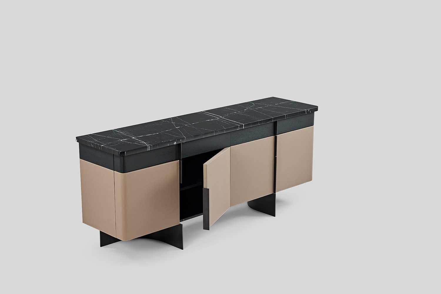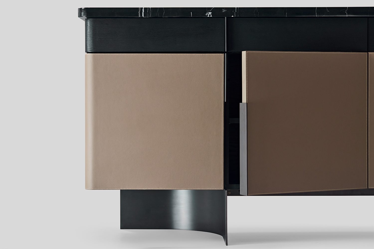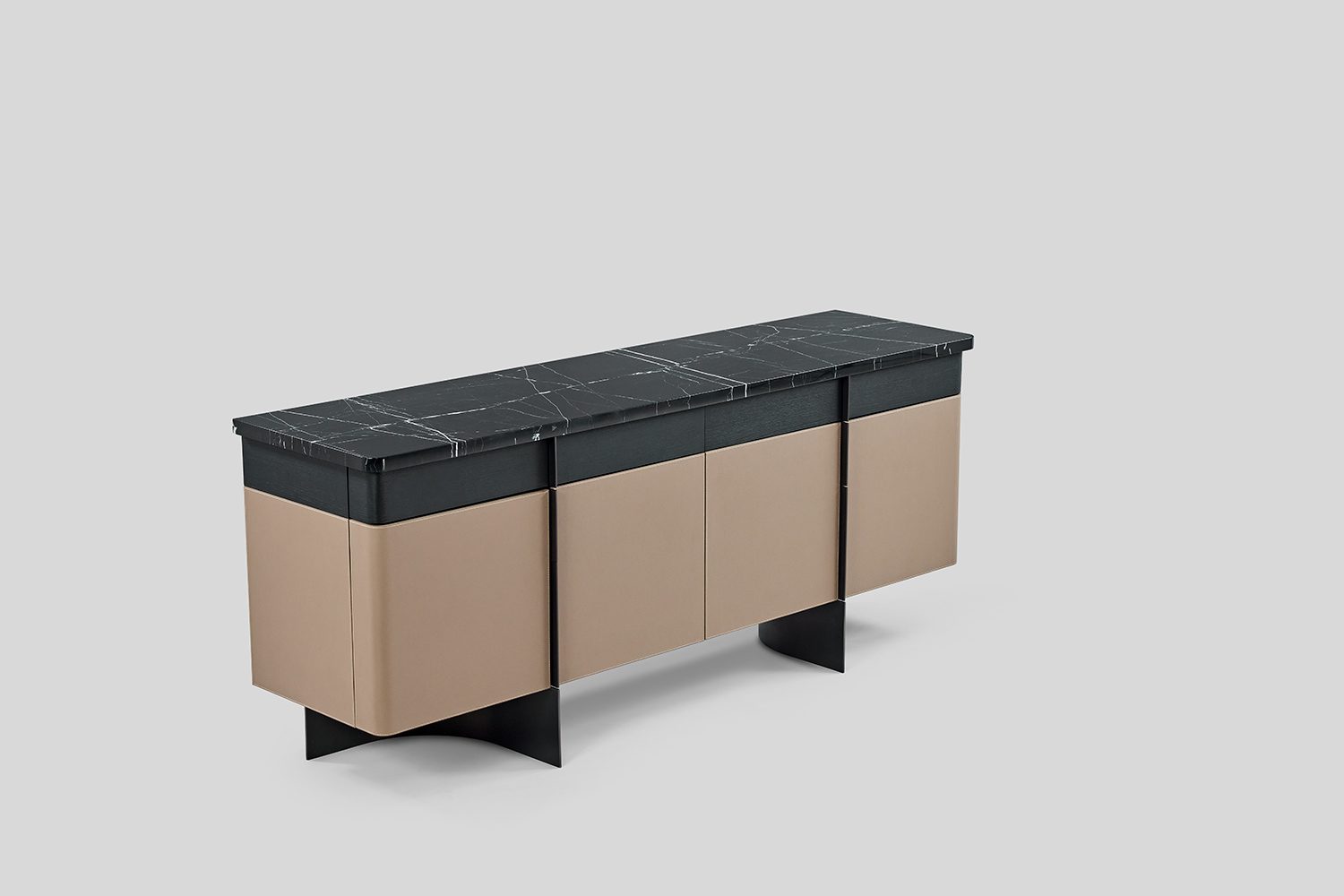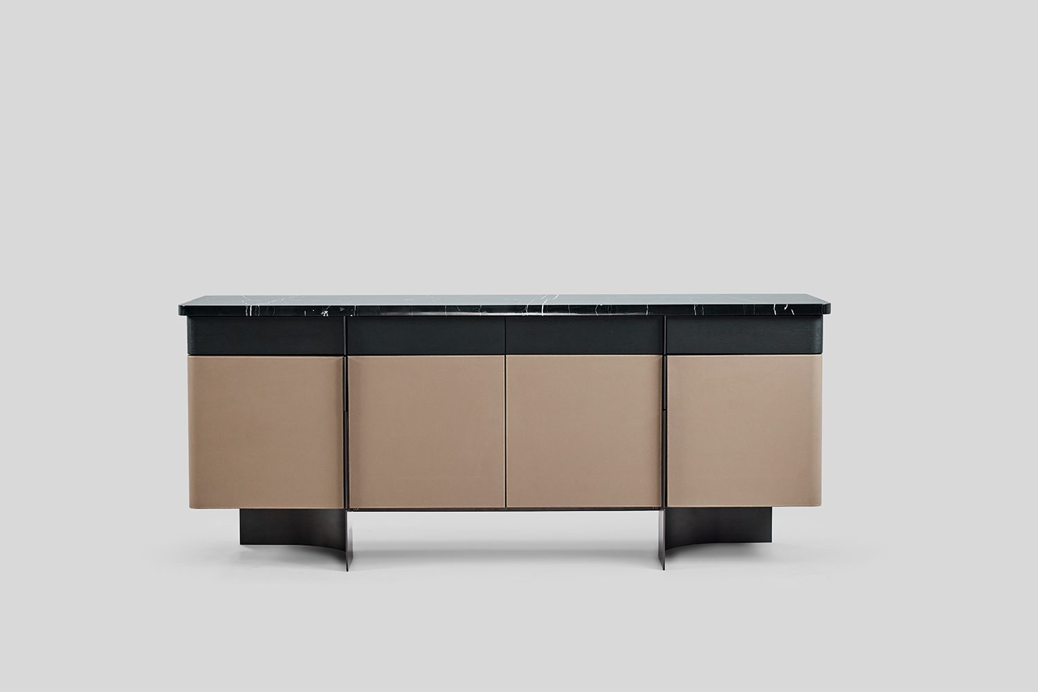 Bold and composed, the Duke Sideboard commands attention with its grand presence and interesting material play. A horizontal band of drawers in veneer tie together a luxurious stone top and leather-wrapped shutters—an interplay of texture that feels both classic and contemporary. The legs curve gently beneath, rising up and extending into handles, blurring the line between function and form. Duke is more than storage—it’s a statement piece that anchors the room with quiet confidence and sculptural grace.