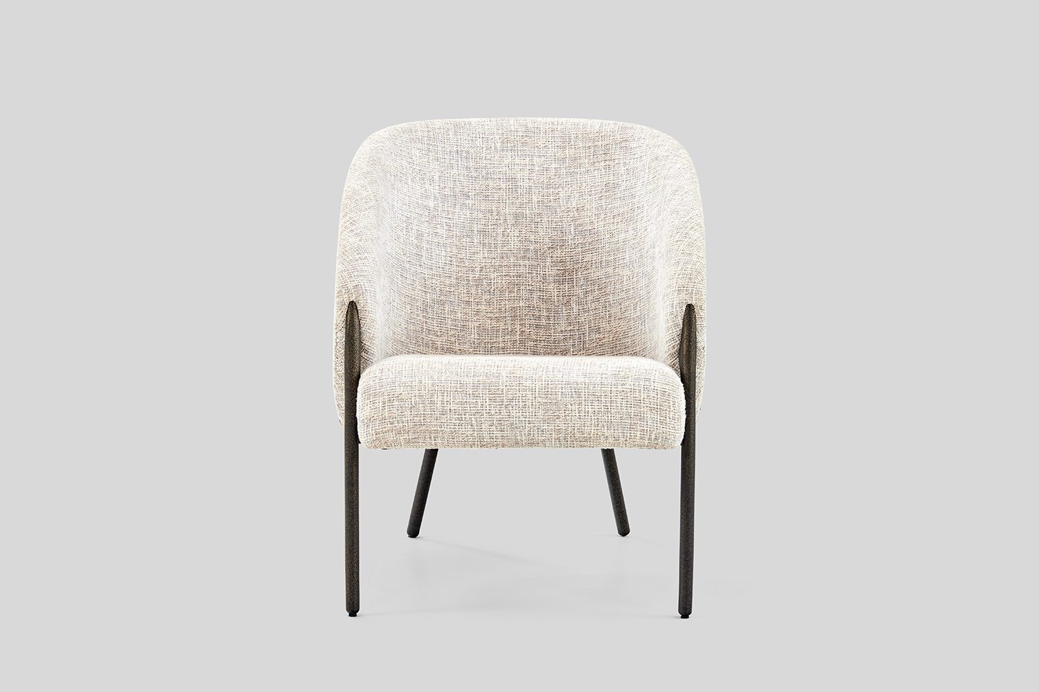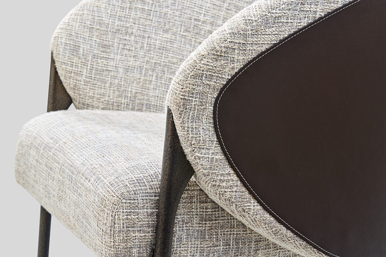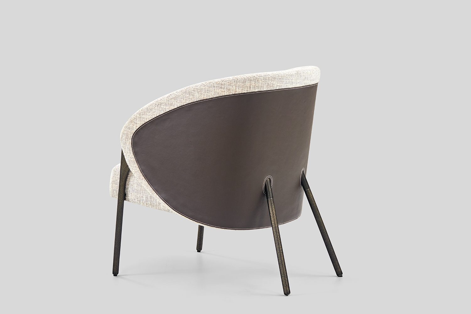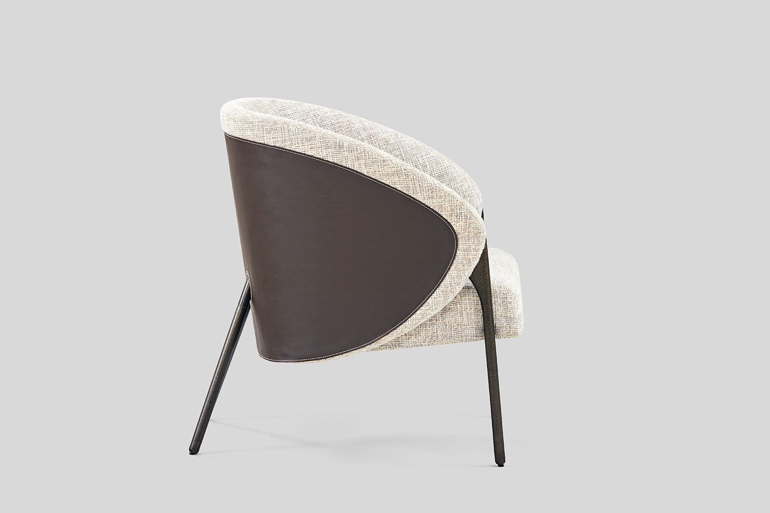 The Ether Lounge Chair picks its silhouette from a guitar pick – its softened triangular profile giving the chair a fluid form. The form wraps around in a continuous, enveloping shell, creating a sense of comfort and containment. A play of dual materiality – the outer shell of the chair is rendered in leather, while the inner bucket is upholstered in fabric. This contrast accentuates the chair’s sculpted volume and layered construction. The chair’s legs appear to grow organically from its body, as though the structure naturally extends downwards to meet the ground.