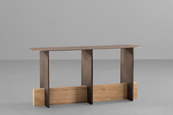 Eben Console is a combination of metal base with a stone top. The silhouette of the console has been pared down to clean lines. Numerous metal panels are put together in V-formations to formulate the base. The variation in antiquing of each panel lends a unique character to this statement piece. The top of the console is made in stone, which is rounded at the edges. This console is available in three sizes, offered in a range of stone and metal options.
