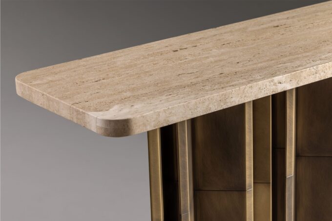 The Prop Console has a unique form and is monolithic in nature. One single finish runs across the entire structure. Variants of it are available in two kinds of wrinkled metal finishes.