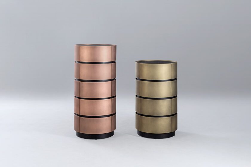 Squillo Chest of Drawers are fundamental yet functional. Conceived in circular and rectangular geometrical rings of metal or wood veneer fascia over a wooden carcass, the product hosts optimum storage for basic utility items.